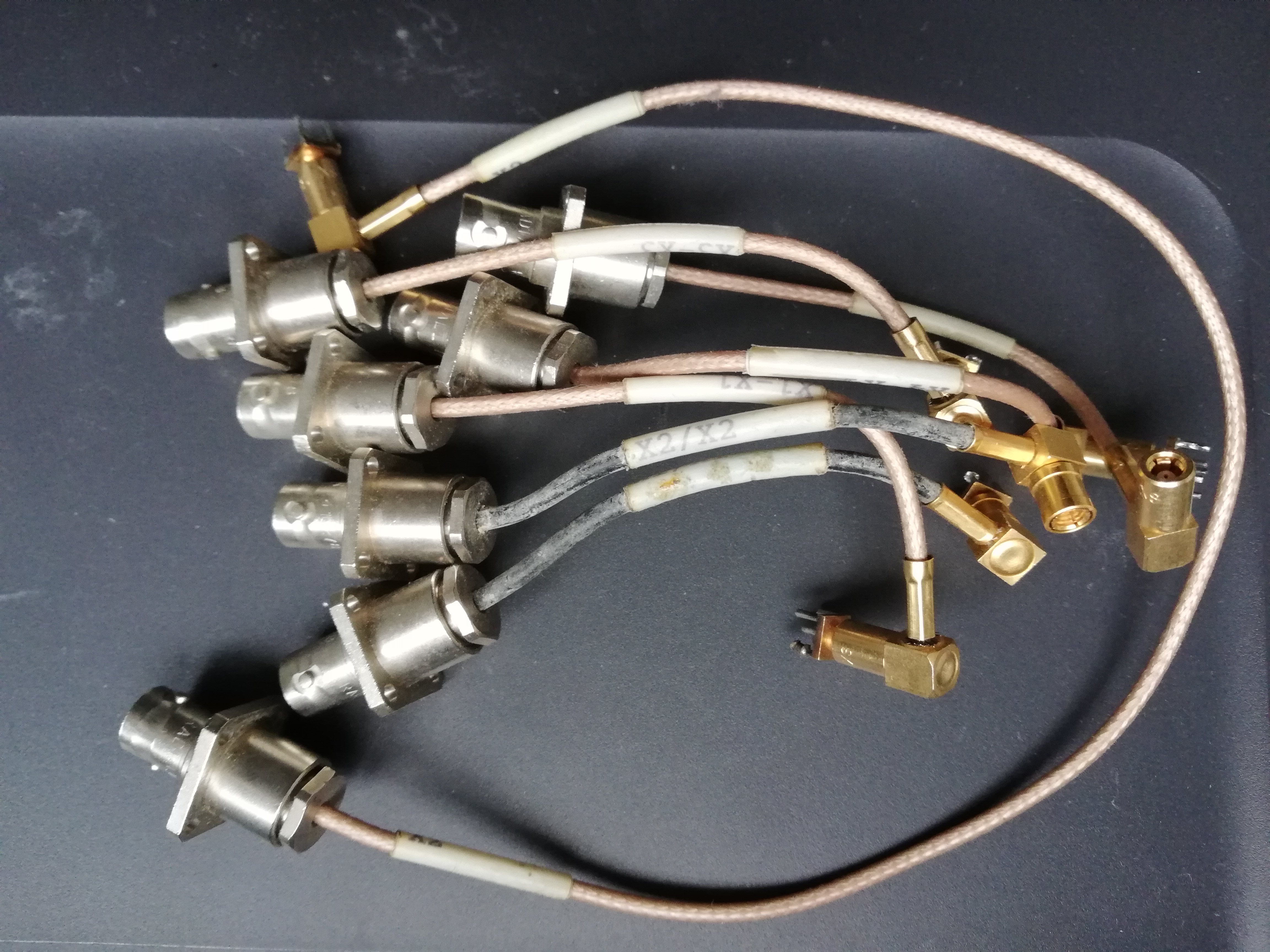 Кабели с разъемами на концах. На одном конце гнездо BNC с фланцем на 4 отверстия, на втором папа-мама под установку на плату. 25 руб за все. Пишите в личку кому интересно.