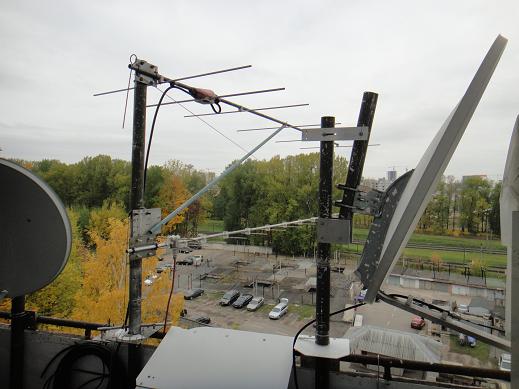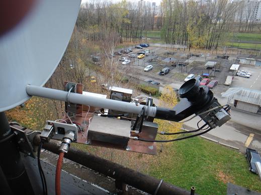 Антенна: оффсетная парабола 90 см. Облучатель 4 элемента волновой канал. Вариант не оптимальный, но из-за нехватки места, приходится использовать параболу на трех диапазонах, меняя только облучатели.