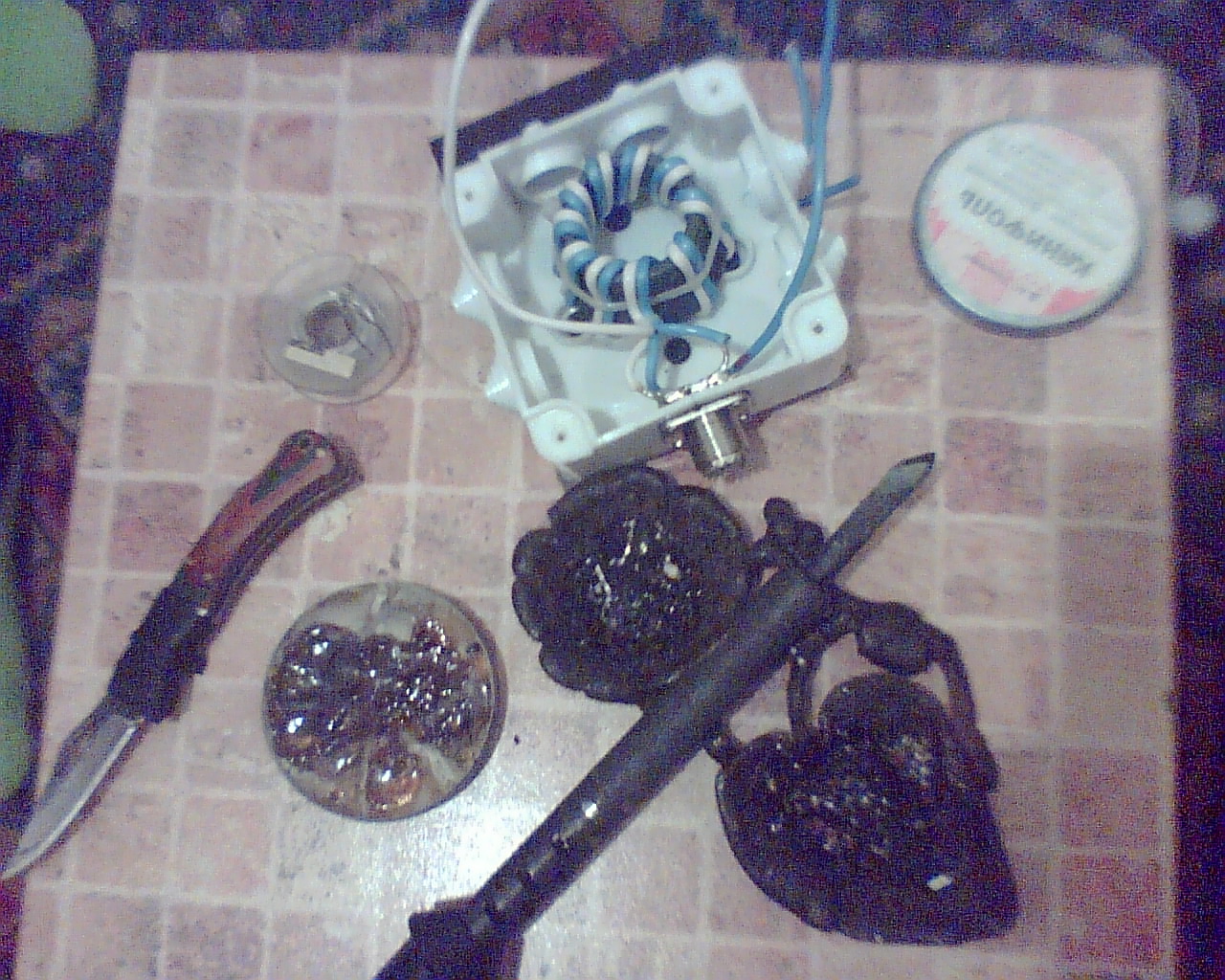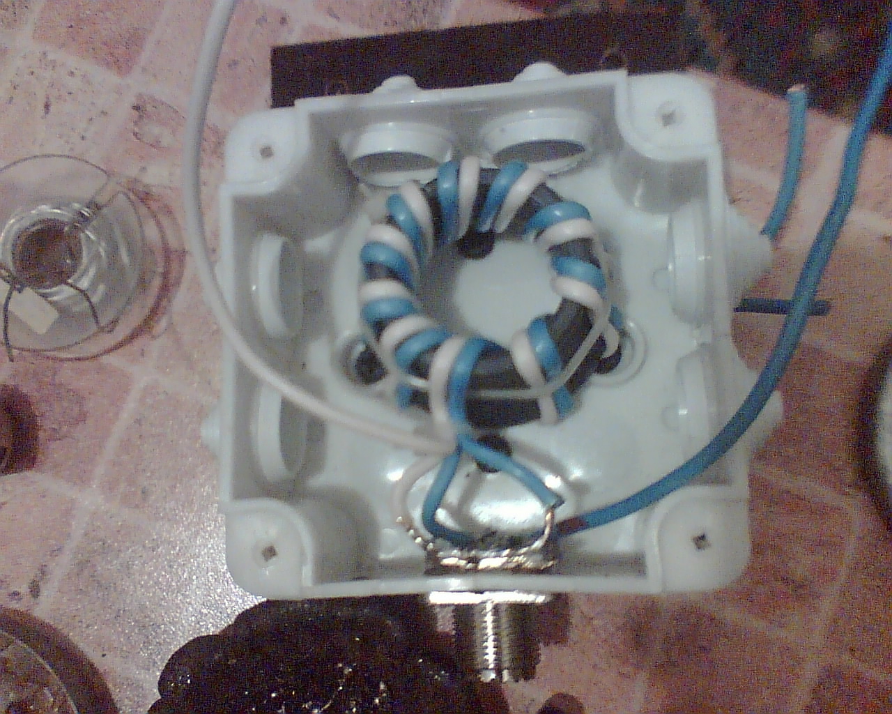 Трансформатор 1 к 4, это 10 пар витков медного провода диаметром 1,5 мм в виниловой изоляции. Намотка равномерно по ферритовому кольцу проницаемостью 400НН. Кольцо от отклоняющей системы ТВ или монитора.