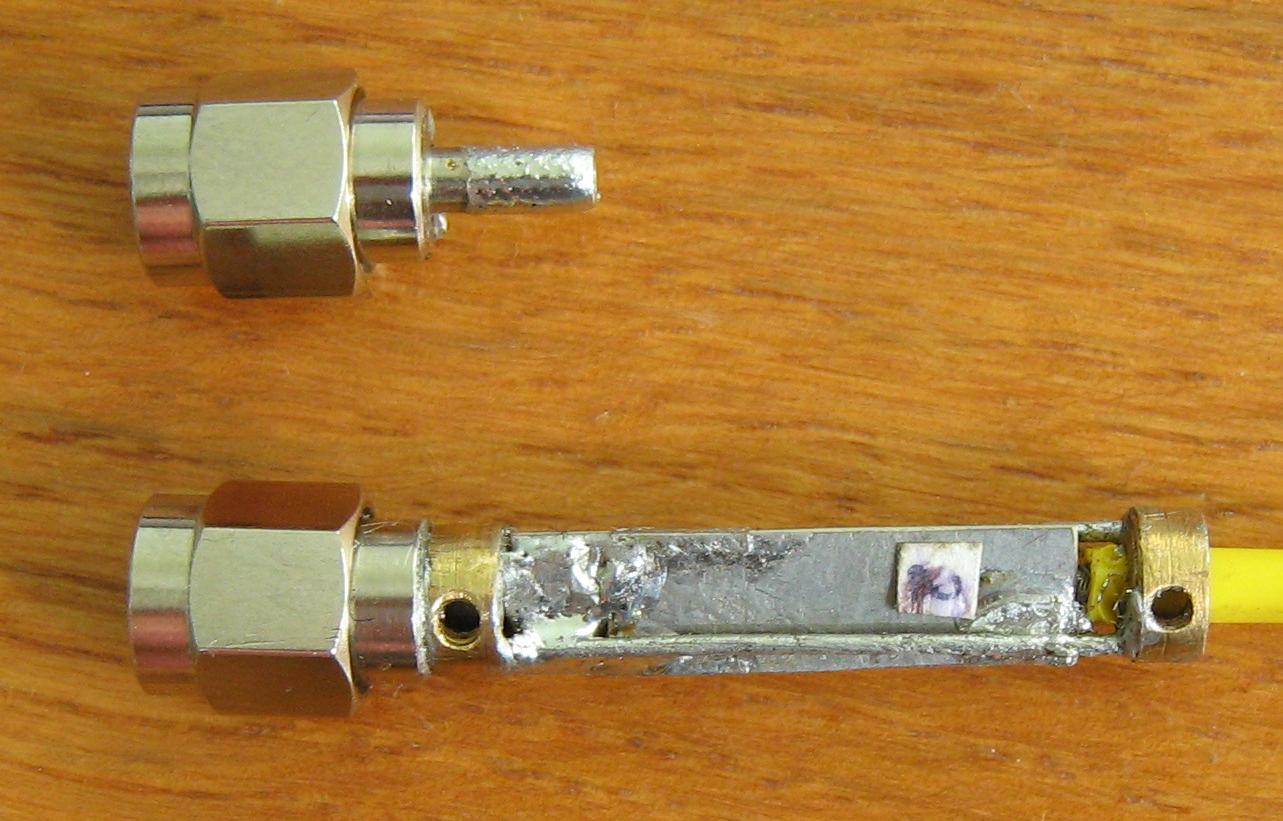 2 – угловой разъем SMA- . Рекомендую использовать для изготовления самодельного эталона нагрузки. Центральный штырь углового SMA закреплен жестко. Тиски и ножовка - и получаем заготовку для пп.3 и 4.