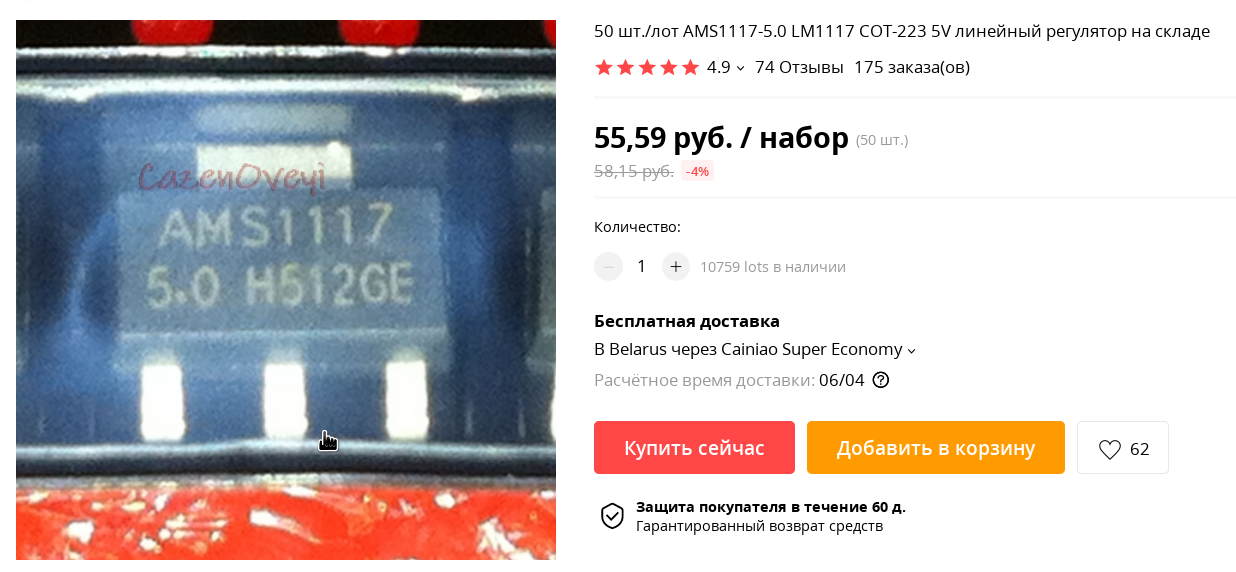 50штук AMS1117-5.0 за $0,82, с доставкой. Нашел прямо в почтовом ящике, видно из Большого камня, курьером.