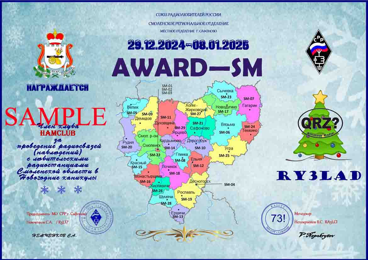 Диплом выдаётся радиолюбителям/наблюдателям членам клуба HAMCLUB/HAMLOG за проведение QSO/SWL c радиостанциями Смоленской области в Новогодние каникулы с 29.12.2024 по 08.01.2025 г. видами излучения CW, PHONE, DIGI на всех любительских КВ и УКВ диапазонах. Необходимо набрать 10 очков. Каждая связь с радиостанциями Смоленской области дает 2 очка.
