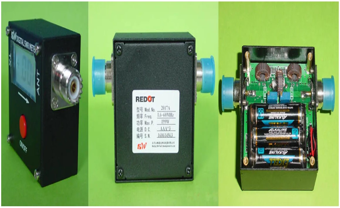 * Дисплей: ЖК-экран (LCD) с синей подсветкой, отображающий текстовые значения прямой/отраженной мощности и расчетный КСВ.
