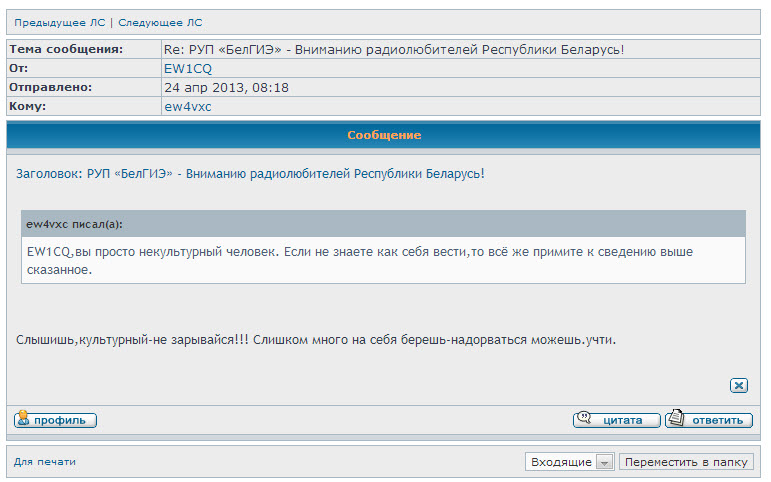 Вниманию АДМИНИСТРАТОРОВ! За некультурное и хамское поведение на радиолюбительском форуме,угрозы пользователям,НАСТАИВАЮ на ИСКЛЮЧЕНИИ пользователя под ником EW1CQ/EU1U из пользователей QRZ.BY/FORUM !!! (БАН FOREVER)