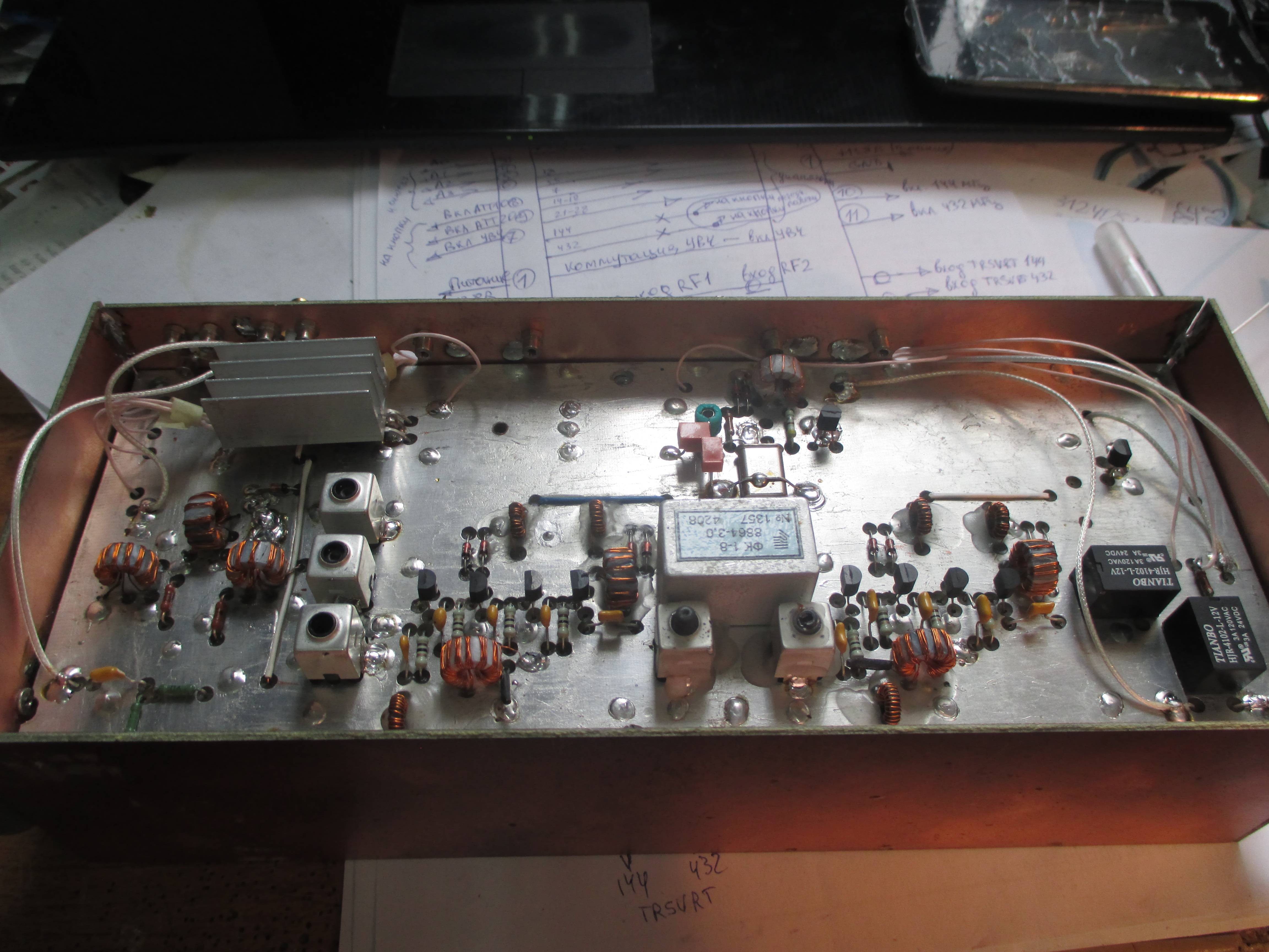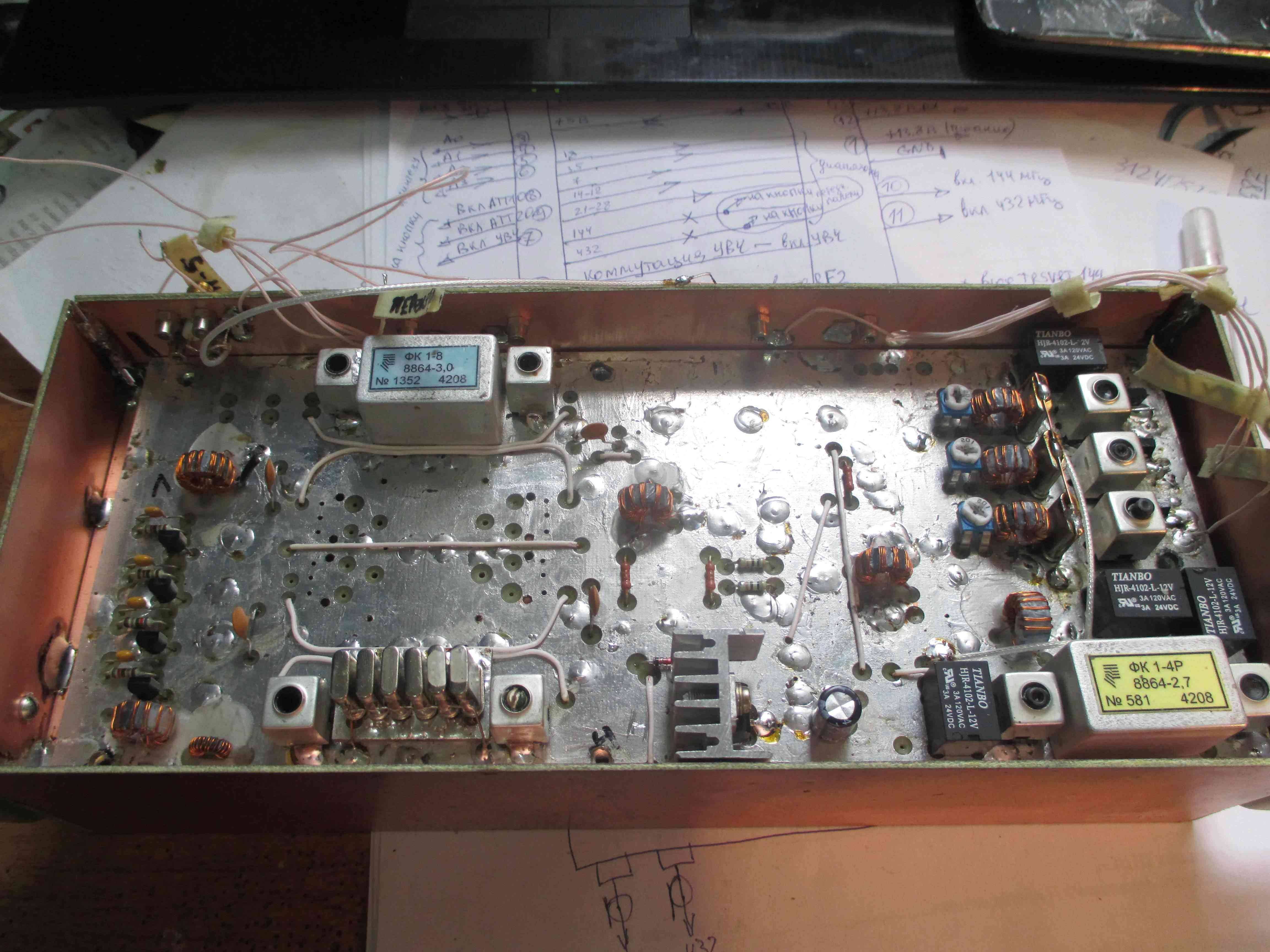 и трансивер появился на свет...Делал я его не спеша, много чего пришлось переделывать по несколько раз, вобщем, получился такой полигон для отработки разных схемотехнических решений. Мне было очень интересно. Не буду говорить, что получился какой-то выдающийся аппарат, но тем не менее предварительные измерения мне нравятся! В цифрах подробностей пока нет, но трансвертеры 144 и 432 МГц входящие блоками в состав трансивера и ради которых вобщем-то все это и затевалось я немного обмерил и писал об этом в теме УКВ аппаратуры. Основная часть схемы - блоки ВЧ, ПЧ и НЧ созданы на основе конструкции Ильи Усихина RW3FY, Моей задачей было приспособить его схемы к моим задачам, кое-что изменить или упростить и при этом ничего не испортить в тракте обработки сигнала. Синтезатор "Воробей" от Геннадия Завидовского. Покупал у него печатные платы с запаянной процессорной частью, остальное сам...