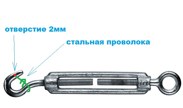 В крючке талрепа просверли отверстие 2 мм и потом завяжи проволокой.
