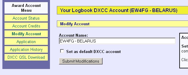 Через Modify Account (кнопочка слева) надо сделать EW4FG основным и на него и будет выдаваться диплом.EW4FG писал(а):Интересно, при новой заявке, на какой позывной будет выписан диплом ...
