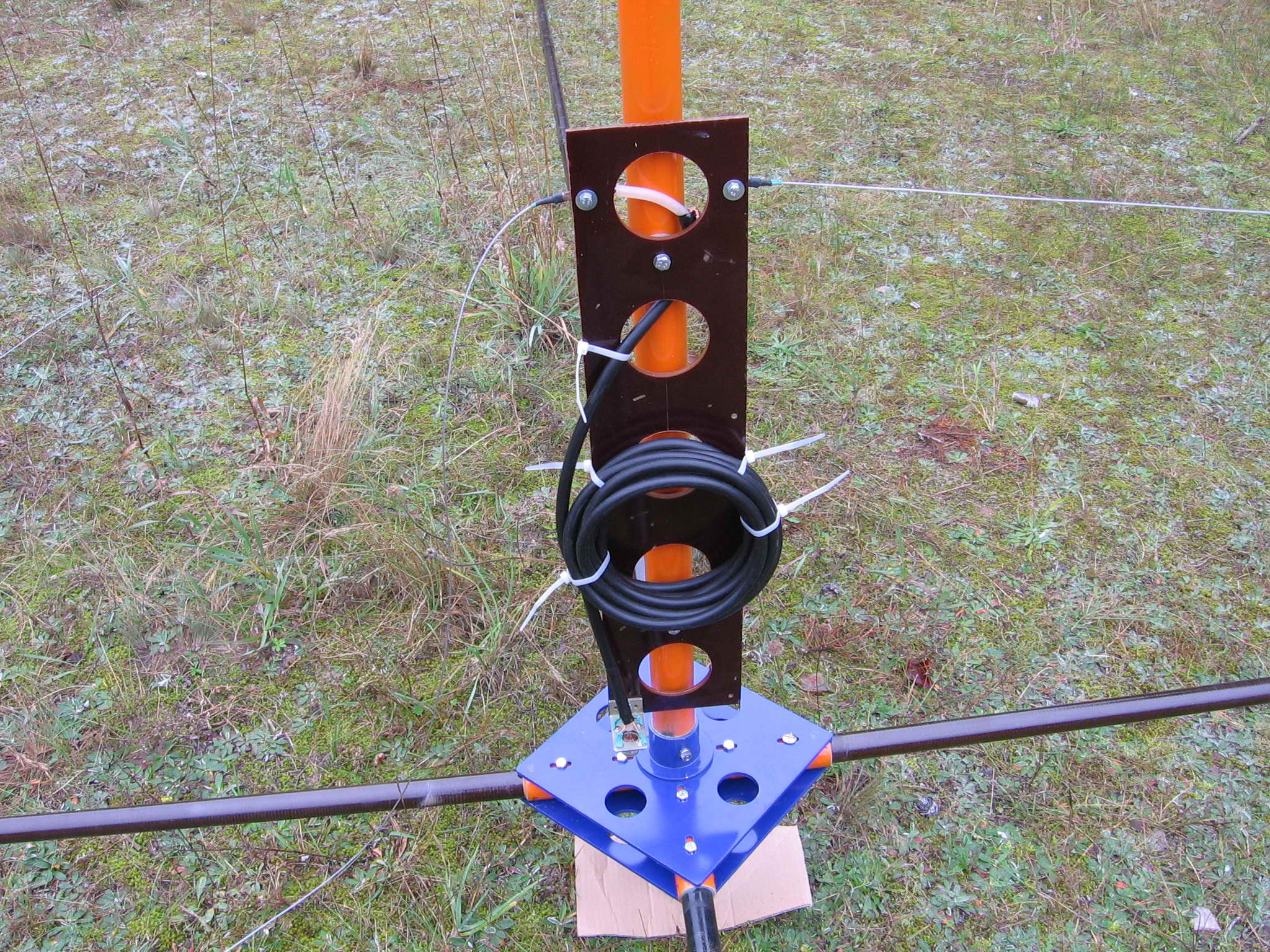 В качестве изолирующей пластины для крепления вибраторов я остановился на текстолите толщиной 6 мм. Точнее, остановился, не успев толком разогнаться, ибо ничего другого в поле зрения не оказалось. Пластина досталась мне, примерно пол на пол-метра, Ну, и как от неё отрезать полоску в 100 мм? Крутил – вертел, и взор мой упал на школьную циркулярку. Оказалось, что универсальная фреза, которую легко купить в ближайшем хозмаге, без труда справляется и с этим материалом. Отпиливаю, линию среза даже обрабатывать не нужно. И тоже высверливаю в ней облегчающие отверстия, диаметром 60 мм. Это облегчает пластину на 110 грамм, и несколько скажется на уменьшении парусности антенны в целом. Сверлим отверстия для крепления вибраторов, закрепляя в них болты М5, с гайками – «барашками», а в нижней части закрепляем на уголке ответную часть антенного разъема. Так как в качестве вибратора используется элементарный полуволновый диполь, с входным сопротивлением 50 Ом, то никаких согласующих устройств не требуется. Другое дело – соблюдение симметрии. Из вариантов симметрирующих устройства, из-за отсутствия ферритовых колец, выбираю СУ в виде бухточки из питающего кабеля. 8 витков 50 Омного кабеля, диаметром 150 мм. Такое СУ очень простое, не требует дополнительной влагозащиты, а главное, удобно размещается на изолирующей пластине, и крепится к ней капроновыми стяжками. Собранный в общий узел изолятор крепим к топ-мачте, через две радиусные шайбы. Сердце Спайдера готово!