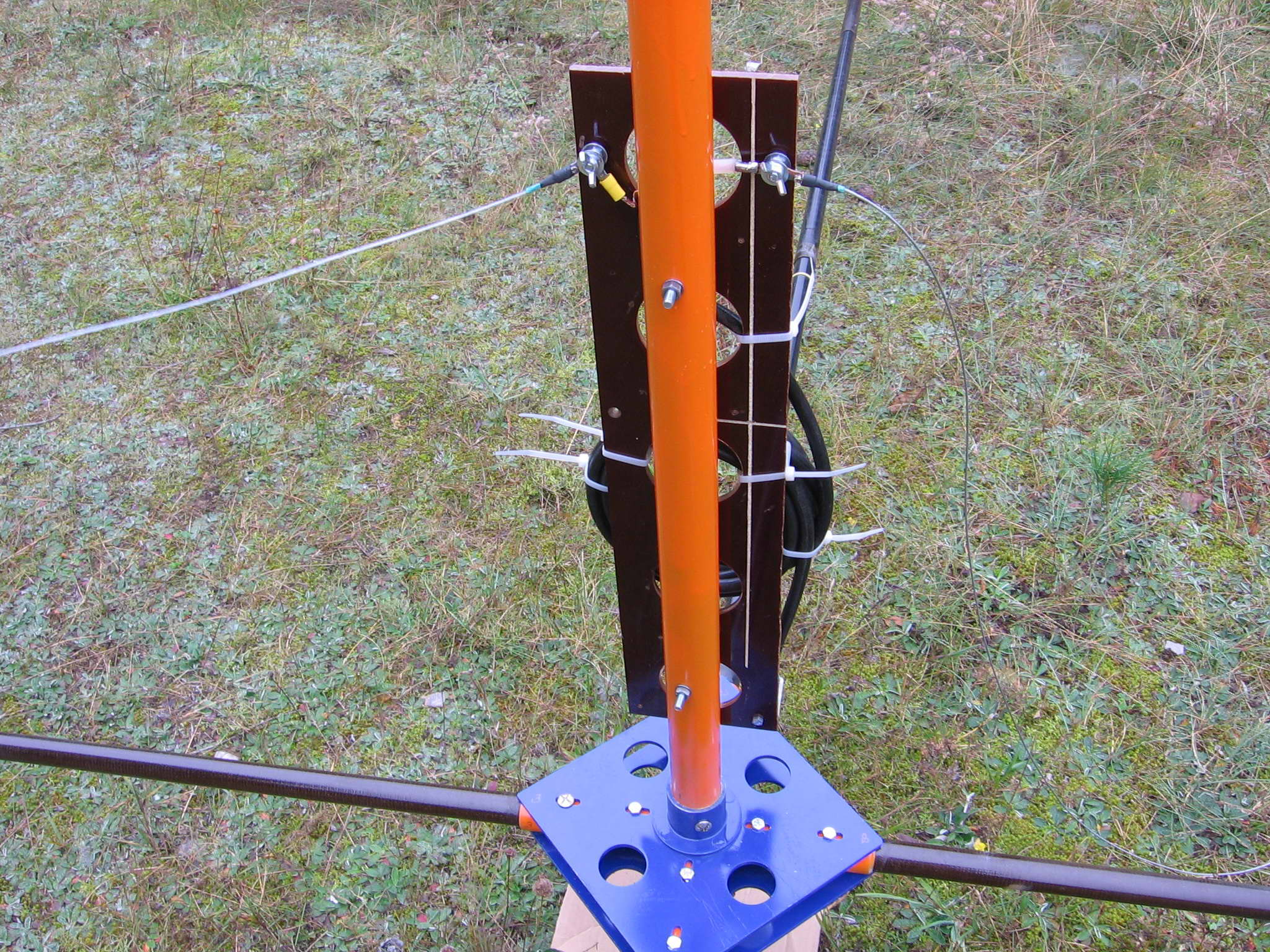 Первым делом собираем крестовину. Наращиваем распорки и расчаливаем их на топ-мачту. Подсоединяем вибратор, рефлектор и директор, растягивая их к торцам распорок до выборки провесов. Подключаем кабель. Спайдер готов к подъему на высоту.