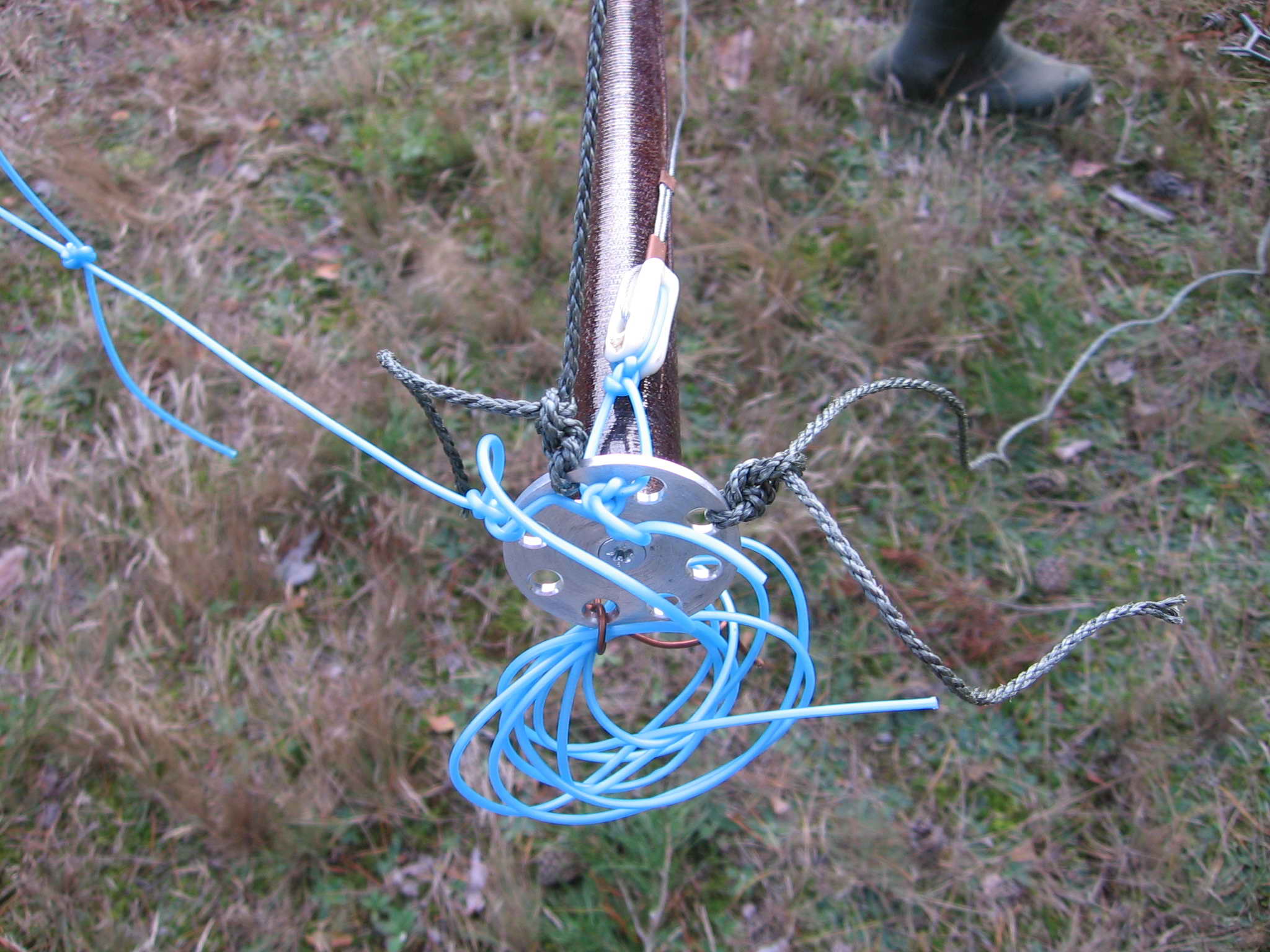 Очень удобно. Теперь дело за растяжками. Сначала, всю крестовину растягиваем на топ-мачту. Лично мне приглянулся 3-х мм перлоновый ( по русски – синтетический, витой) шнур из рыбацкого магазина. Во первых, он совершенно не тянется, во-вторых – дополнительно пропитан каким-то влагоотталкивающим составом (на ощупь, как пропарафиненый), в-третьих, тоже до 90 кГ на разрыв. То, что надо! Для крепления растяжек по торцам распорок, были изготовлены четыре дюралевые заглушки с фланцами, на которых просверлено 8 радиальных отверстий. Для растяжки же излучающих элементов я применил обычную хозяйственную леску, По прочности её вполне достаточно, и вяжется она очень хорошо.