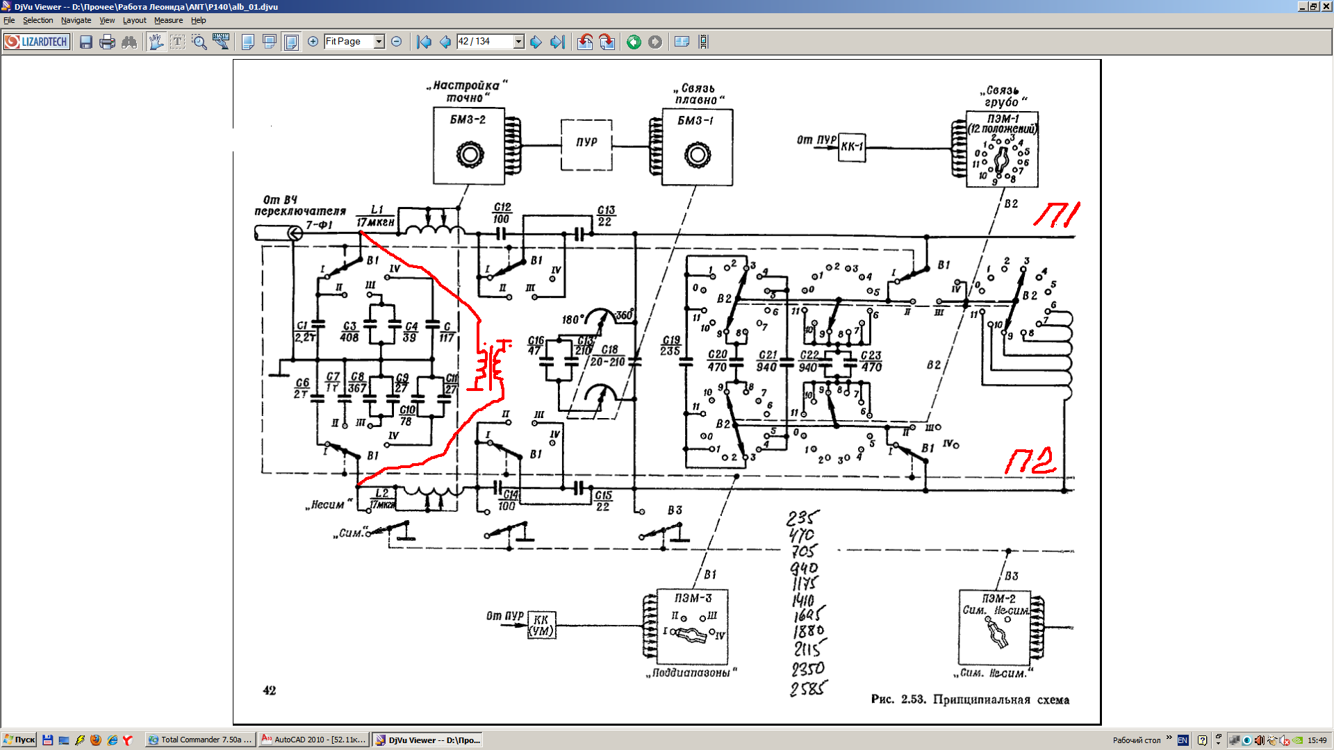 ФСУ применил готовое: УСС от Р-140 (полуавтомат со сдвоенным вариометром в симметричном варианте). На 7-Ф1 (обозначения по схеме Р-140) подаётся моща от СУ и с этой же точки снимается на средние элементы, фаза питания которых условно принята за 0 градусов. С П1 и П2 -Ф и +Ф для питания фронта и тыла соответственно. Требуемые фазы и соотношения амплитуд накручивал по 2-х-канальному осциллографу поочередно подключая второй канал к П1 или П2.( Первый канал - к 7-Ф1). Доработка УСС включением фазоинверсного транса с 7-Ф1 на второй вариометр несколько упростила накрутку и улучшила КПД ФСУ - индуктивности вариометра получаются меньше. Применение 2-х 2-канальных осциллографов упрощает процесс.