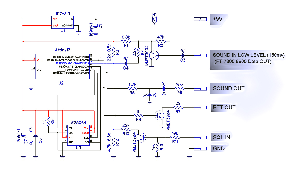 В папке MB SCHEM INSTALL COMPONENT, находится электрическая схема репитера, схема расположения деталей, и печатная плата. Для использования репитера, совместно с радиостанциями Yaesu, с их интерфейсным разъёмом DATA, в схему добавлен дополнительный каскад на транзисторе, так-как уровень сигнала Data OUT составляет не более 200mv.