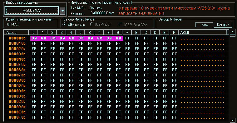 В данные микросхемы памяти, в первые ячейки кода, нужно вписать значения 80, и прошить. (см. рисунок)