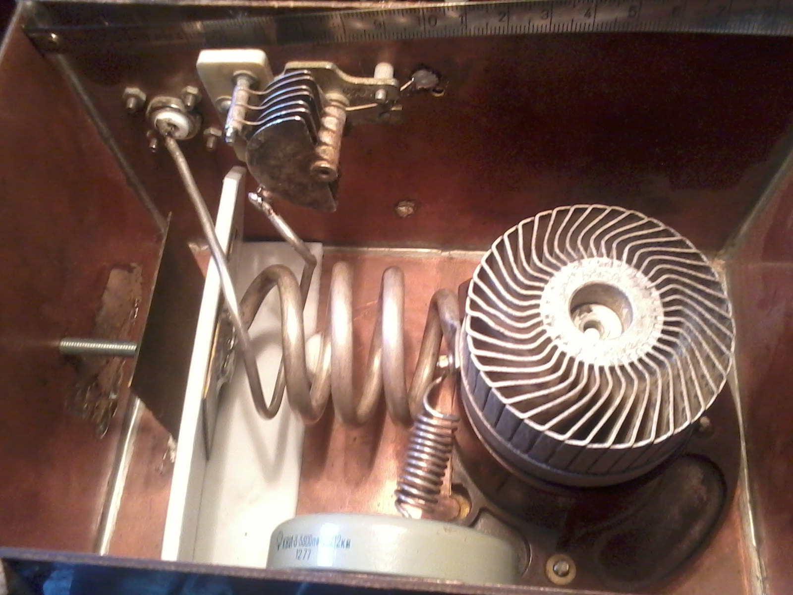 Да лампа ги7бт, 1700в под нагрузкой 450мА. Ток покоя 90мА, сетки макс 100мА. М3-5А ровно 400w показывает(при входной 40w). Этот ум был сделан ещё в1991г., после посещения шэка RA3LE (спасибо, не поленился, достал из под стола и показал конструктив в натуре, да и схемы дал 144,430 своей рукой начертанные). Вечная память таким людям! Надежнейшая вещь, правда пришлось снизить анодное на 300в, и радиатор посер. медь от ги46б (здорово увеличивает рассеваемую мощность лампы). Панелька фирменная-не лучшее решение! Дуется одним ВН-2 на вытяжку. БП трансформаторный в этом же корпусе. По этой же схеме у меня и гс35б на 144 - легко сделать, хорошо строится. До этого не удавалось ни с одной конструкции получить что-то подобное на выходе!