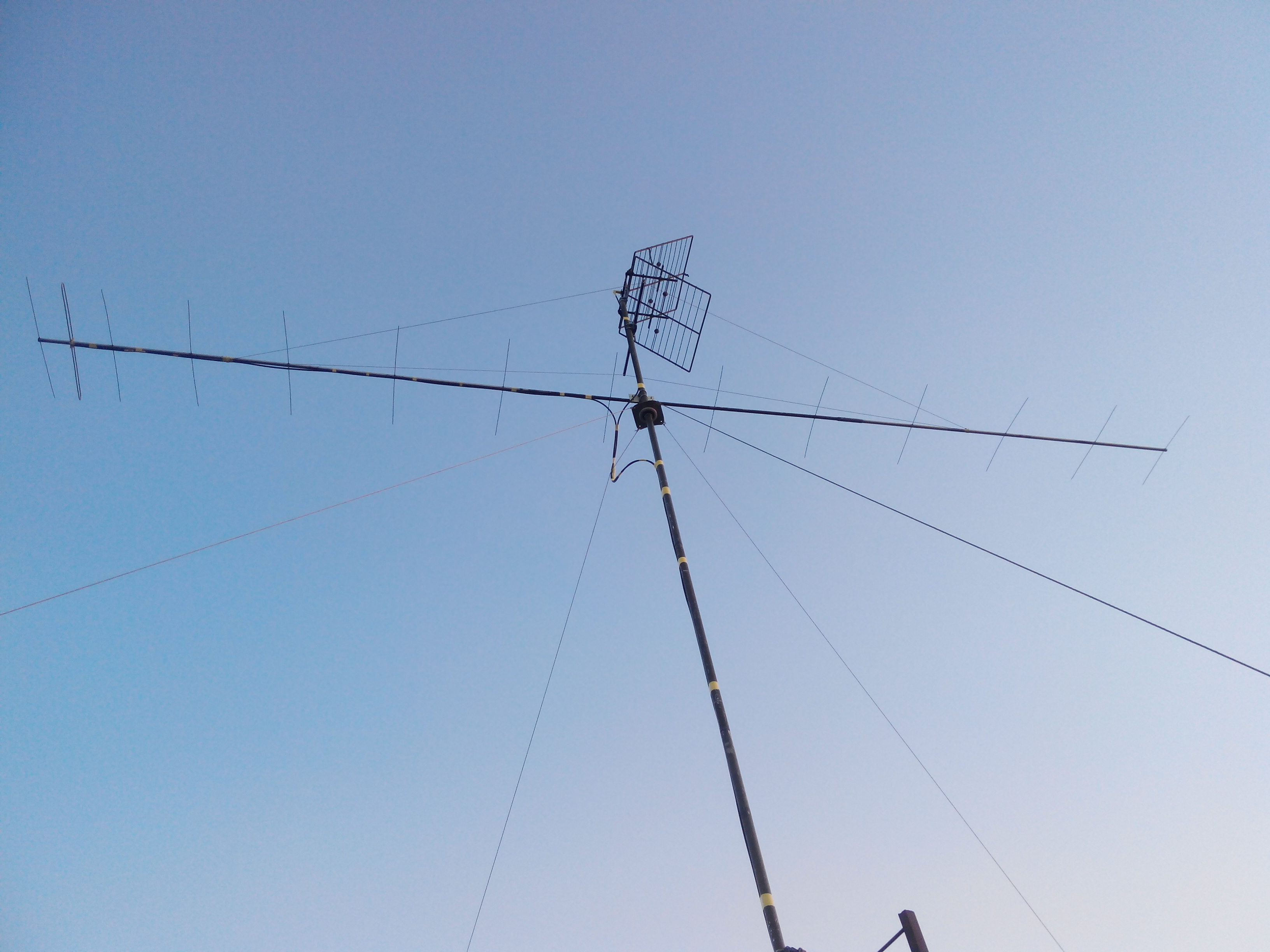 Не успел подготовиться к субрегиональным соревнованием и EWAC, поставить 28эл. на 430. Поэтому временно "водрузил" ант. *ВП* приблизительно этого диапазона (два диполя синф. возб. с решёткой), по паспорту 12db. Не плохо смотрится и работает, но надо подстраивать (КСВ=2). Но по сравнению с работой на ант. 144 это уже хоть что то!