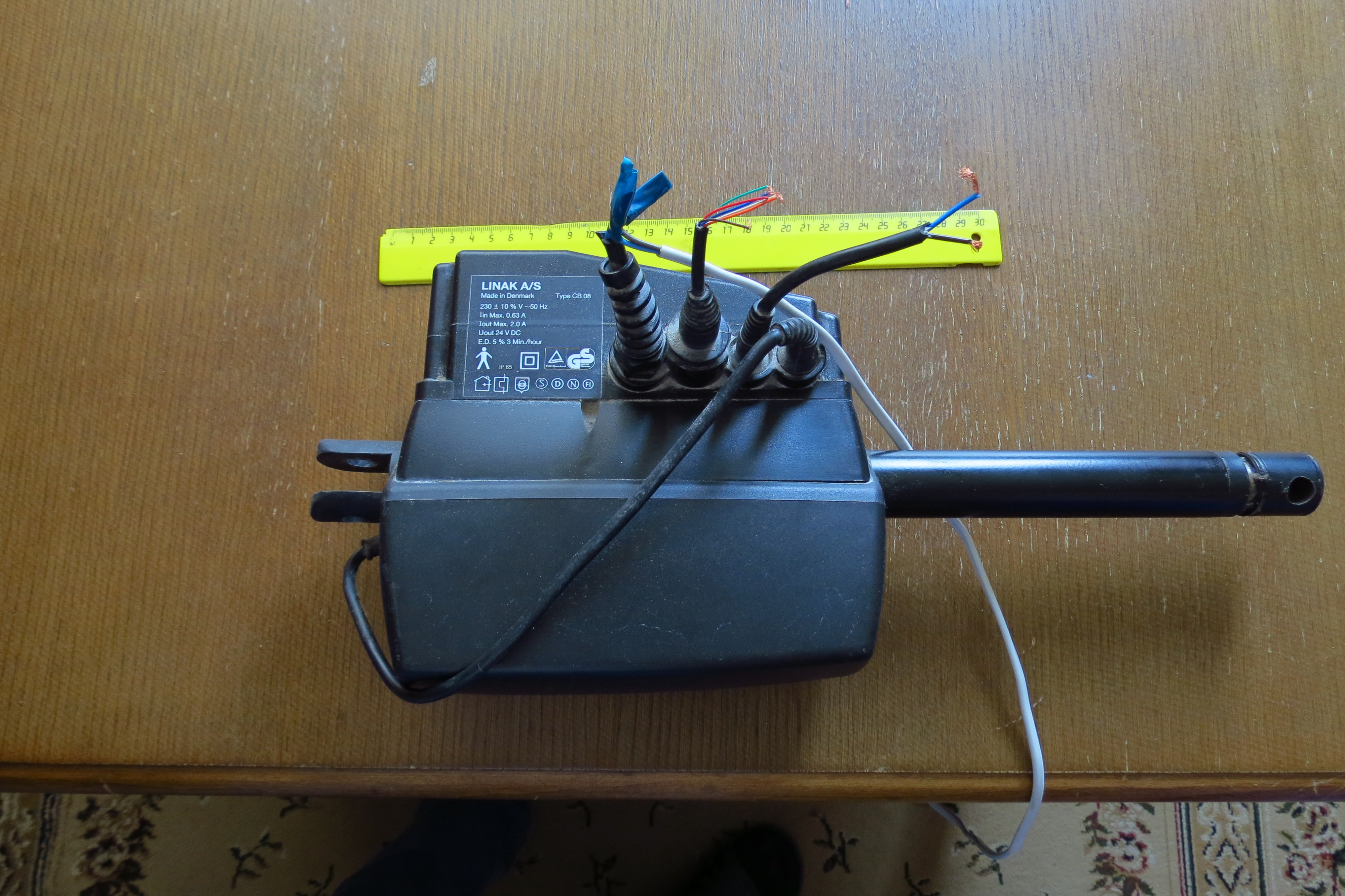 Прочный пластиковый корпус, внутри блок питания, куча "релюшек",концевики. Запитывается от сети 220в, на выходе 24 в для питания мотора.