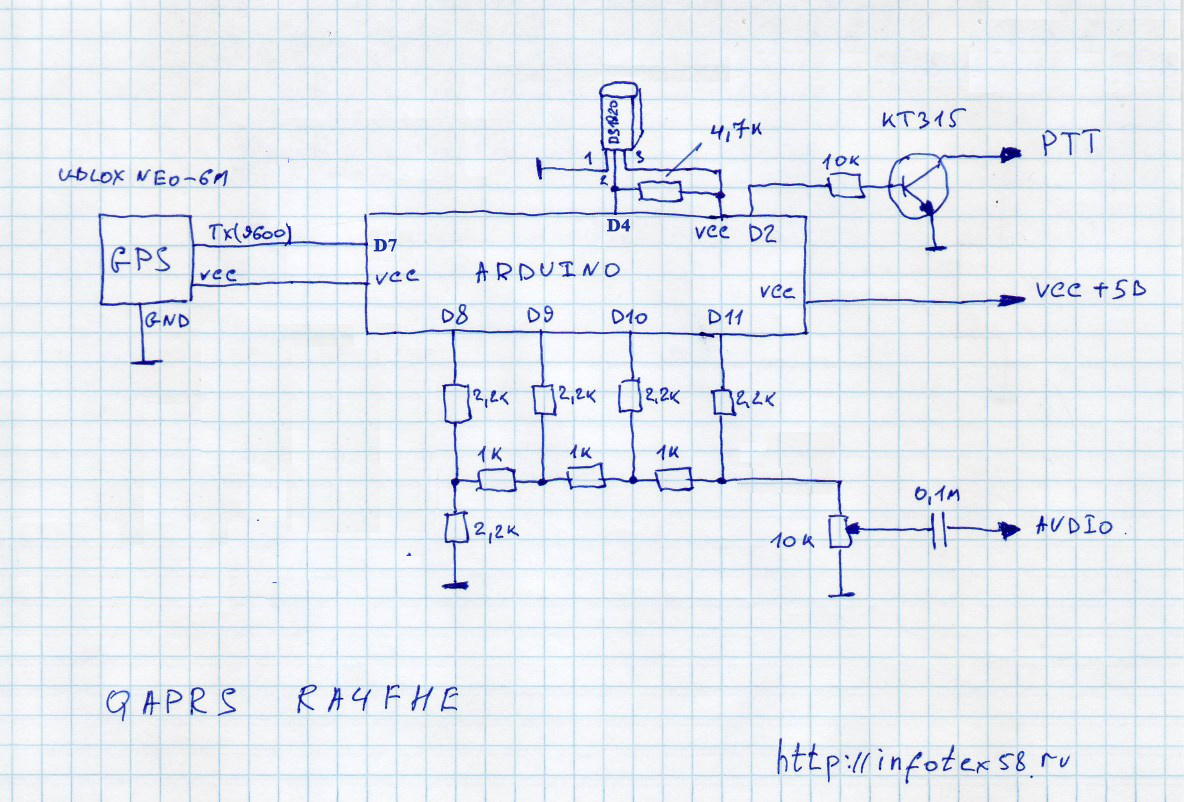 Наваял тут простенький APRS маячок. Схема из интернета, немного переделал под свои нужды.