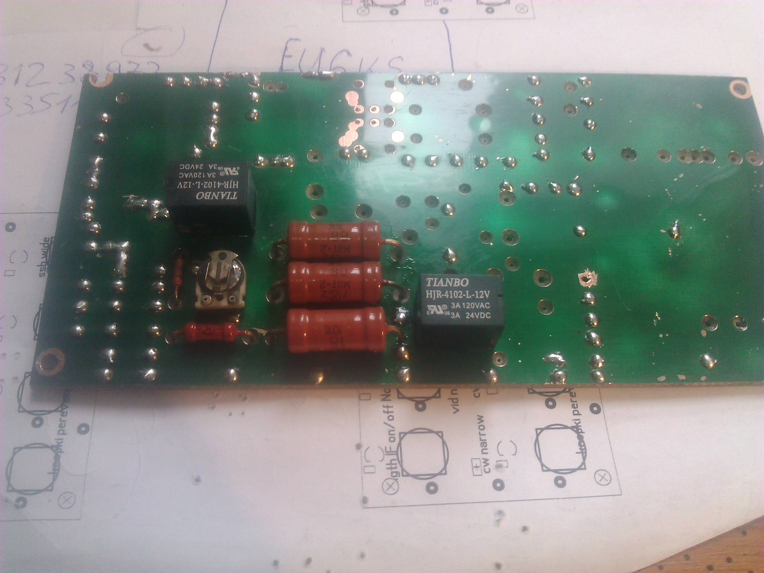 Несколько фотографий в процессе сборки у RX3DR и EU2TT. На фото видны заклепки, которые мне подсказал использовать Александр RX3DR в качестве межслойных перемычек - это очень удобно!! Заклепки Ф 0,9 мм покупались на Aliexpress. Платы с зеленой маской, это также самодельные - Руслан EU2TT постарался !