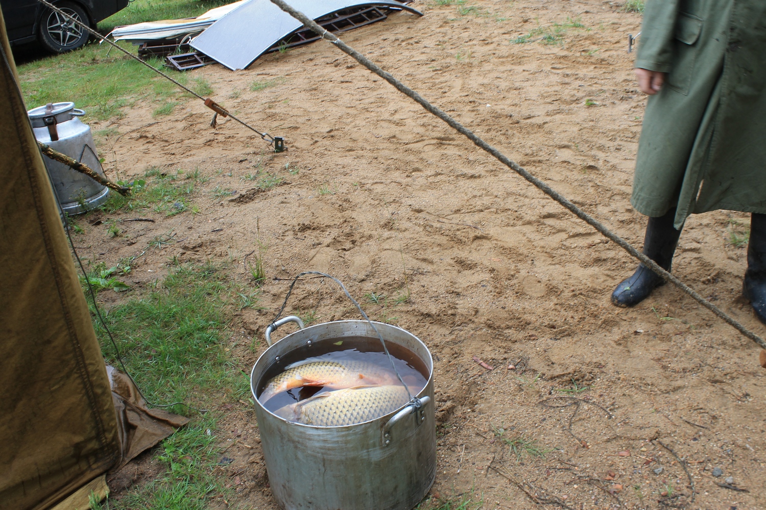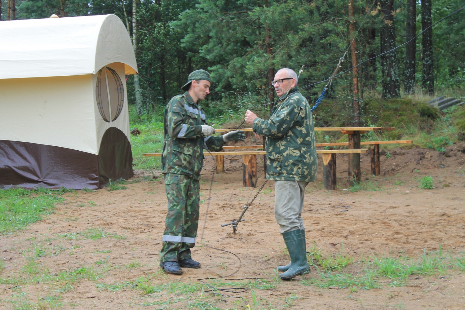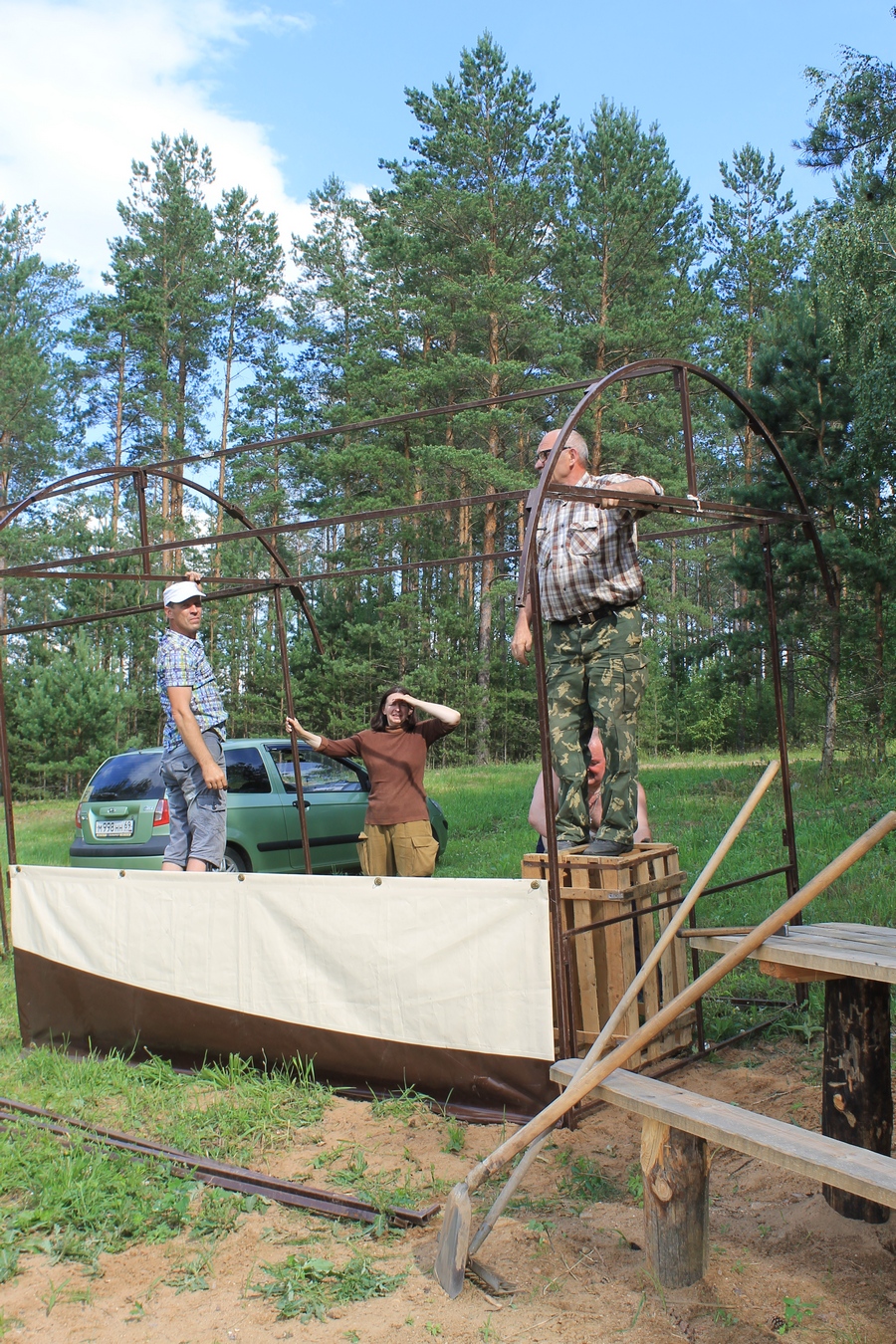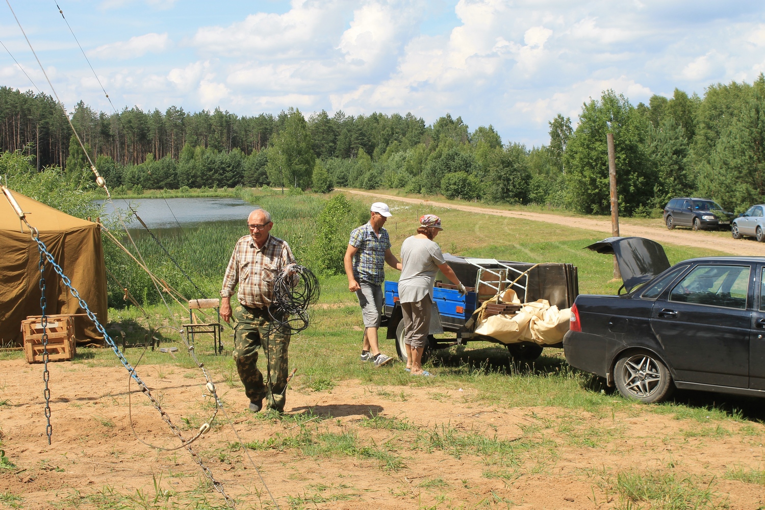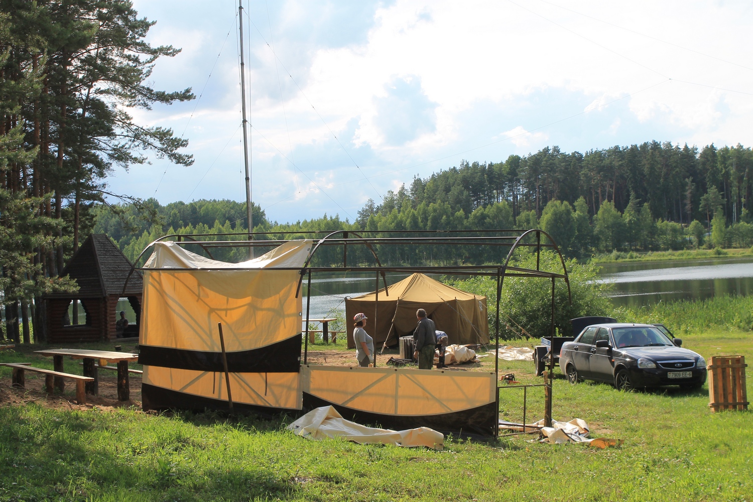 Проcмотрев прогноз погоды,решил не рисковать и заранее (в четверг 13 июля) развернуть на центральной площадке палатки и КВ-позицию.Именно в этот день на место расположения слёта отправился десант- EU7AL,EU7LA,Алеся и Сергей (дочь и зять EU7AL), и наш гость из Твери RA3IX.Погода была отличной.Вашему вниманию-фото от 13 июля: