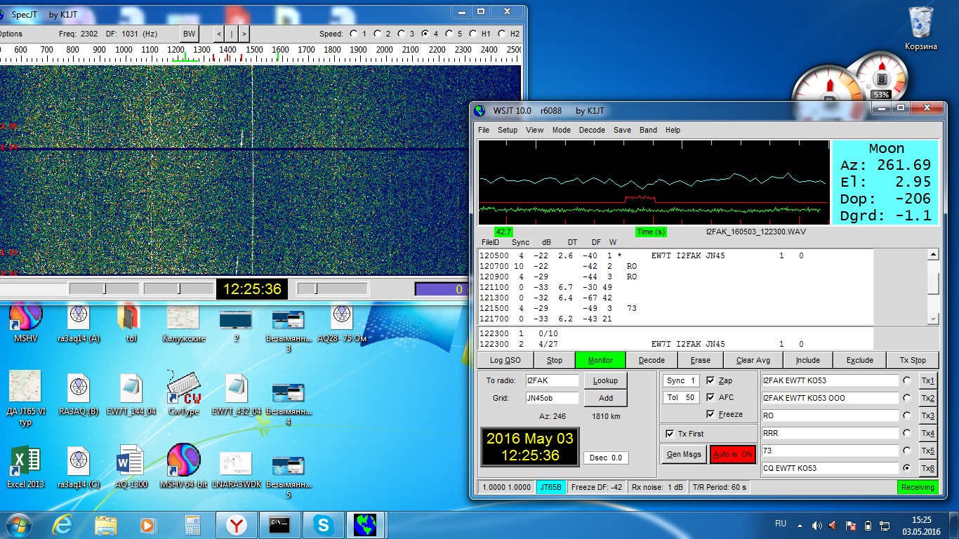 Для меня цифра была тогда вообще "в диковинку". Столько ньюансов повылазило... Первое не было синхронизации по времени (в сутки время убегало на 2сек), потом выяснилось что мой трек клюшкой (оказывается это болезнь всех ICOM 746). Хорошее подспорье для работы JT65 дали мне дни активности. После этого и луна "стала ближе"