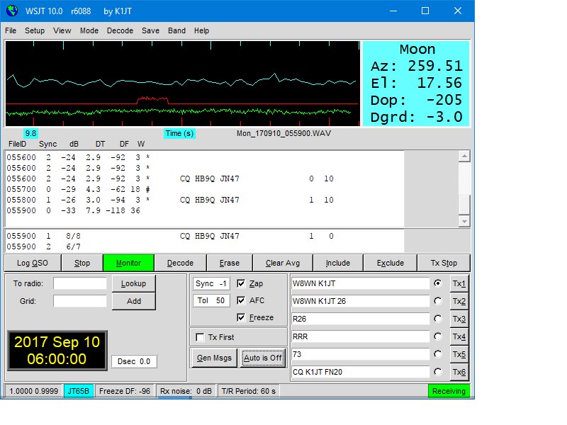 А сегодня вечером, почти сразу стало получаться. Лучше всего принимал корреспондентов когда угол Луны над горизонтом был 4-7 градусов. Слышал за вечер порядка 5-6 разных станций. HB9Q и I2FAK хорошо слышал на слух. Самый лучший прием был I2FAK доходило до -16