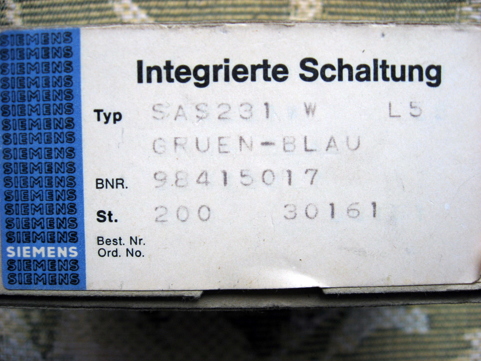 Надпись на упаковочной коробке: Integrierte Schaltung, Typ SAS231WL5, Siemens. Корпус как для SMD монтажа, 6 ног: три с одной стороны, три - с другой. Никаких данных найти не смог. Может кто-нибудь подсказать, что это такое. В упаковке 200 шт, выбрасывать жалко. Вдруг это что-то стоящее и пригодится другим?