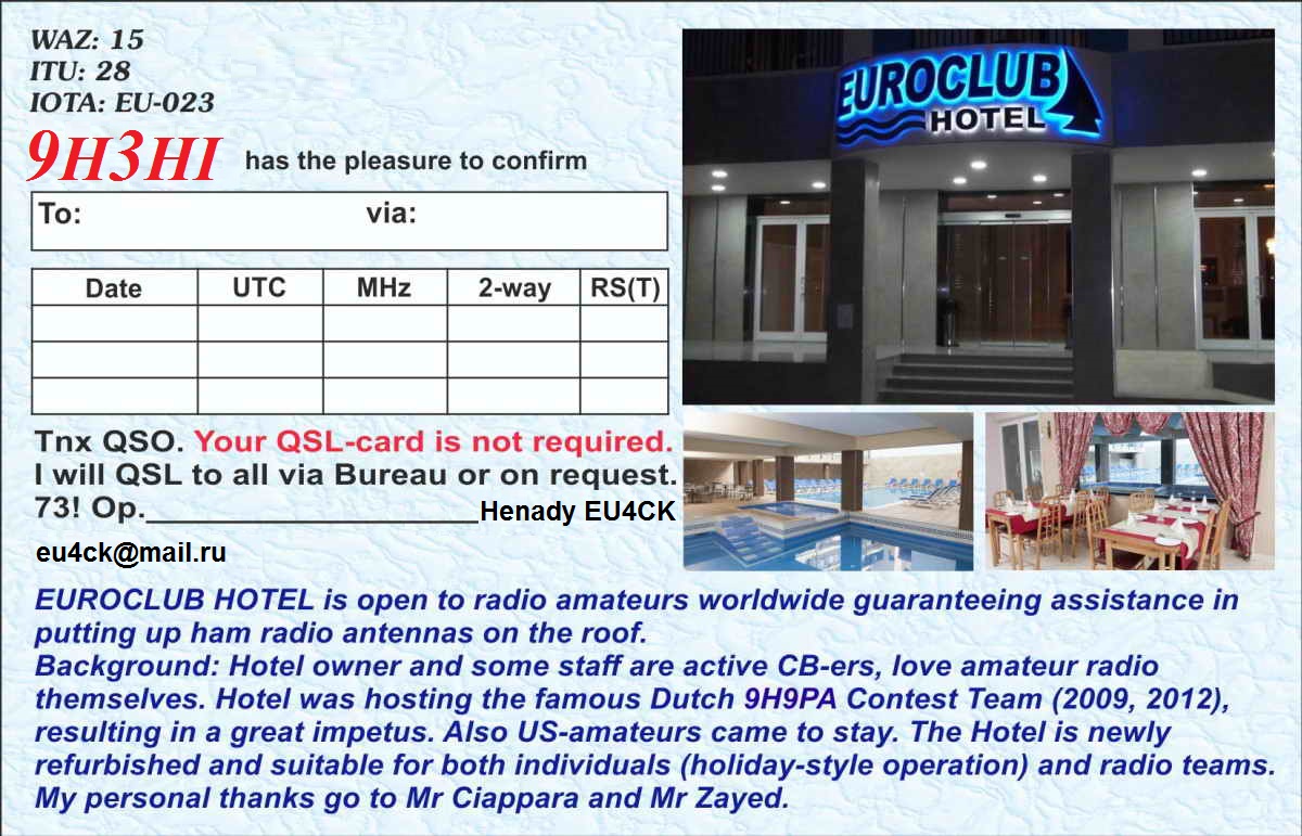 Выезд на Мальту с 22 марта по 2 апреля в прошлом году в составе 9H3JD (DL7VFM) & 9H3HI (EU4CK) был "рекогносцировкой" во время которой были налажены тесные контакты с хозяином и менеджером трехзвездного EUROCLUB HOTEL в городе Bugibba (JM75FW) на северо-западе острова Мальта.