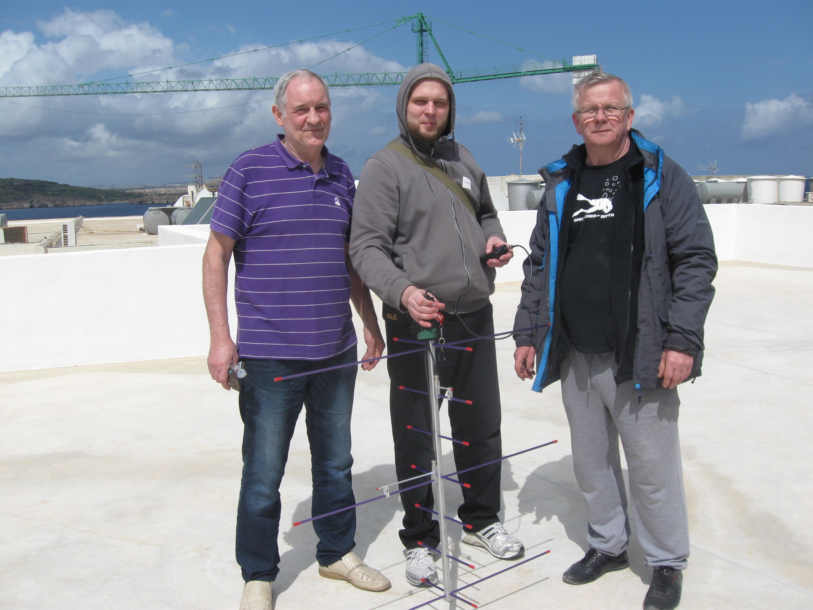 Слева на право: 9H3JD Achim (DL7VFM), 9H3EM Evgeny (EU1MEV), 9H3WT Waldemar (SP4F) на крыше EUROCLUB HOTEL после проведения связей через спутники.