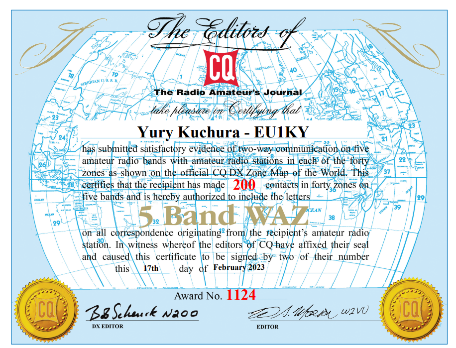 При соискании 5B WAZ необходимо не менее 150 зон, среди этих 150 зон естественно должны будут быть все 40 зон, необходимых для базового диплома.EU3EU писал(а):Чекайте обратно. Сначала получаете только обычный 40-зонный WAZ. После того, как вам будет сообщен номер выданного, формируйте заявку на 5B.ew7dk писал(а):Связи на WAZ и 5B WAZ чекнул в LOTW