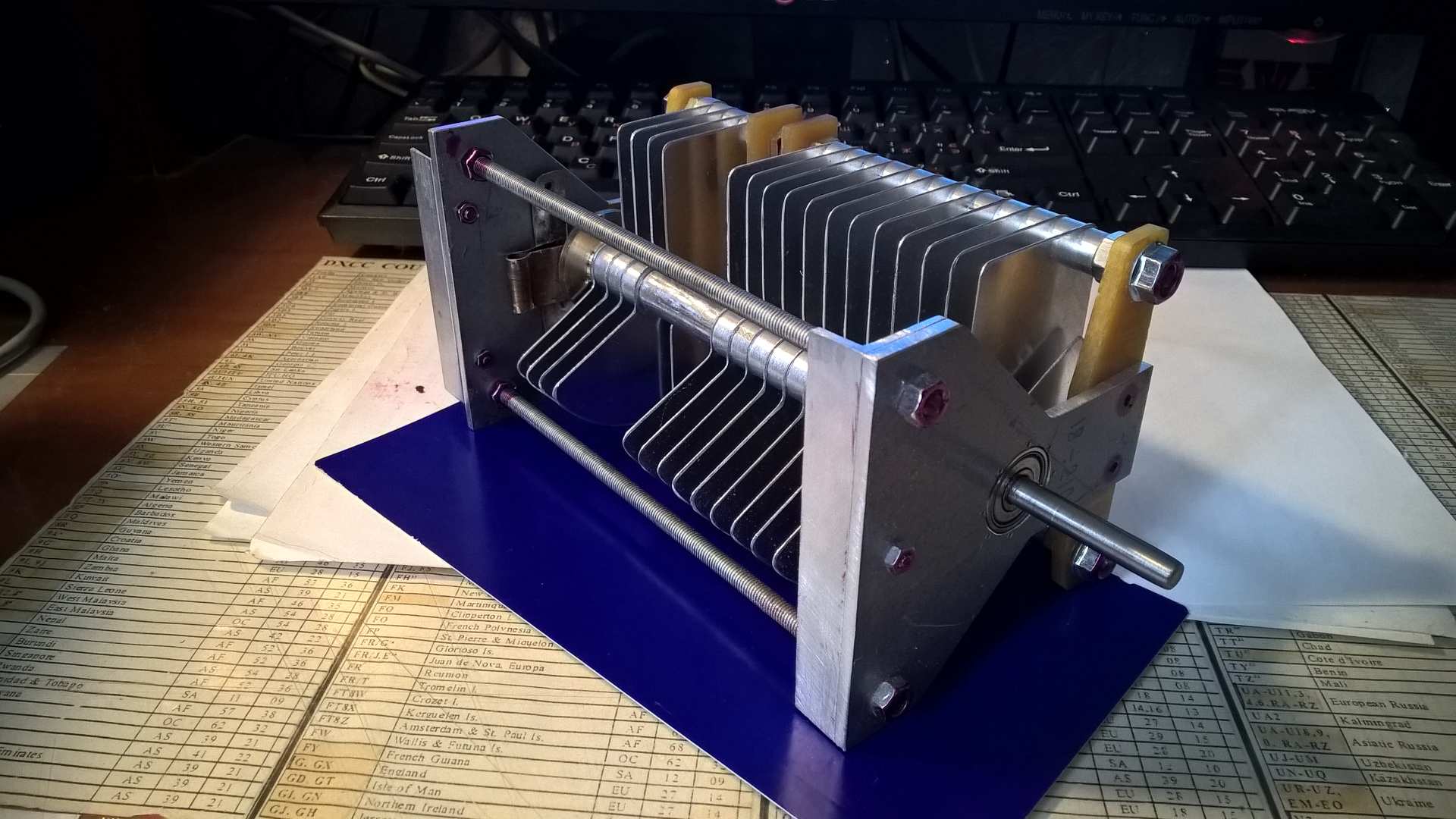 Чтобы сделать КПЕ 300пф с зазором 3 мм нужно резать пластины диаметром примерно 120мм и длинна переменника получится миллиметров под 200. Что это за монстр получится? Представте двухсекционный, примерно пол метра .......? Лучше найдите переменник от Р-140.