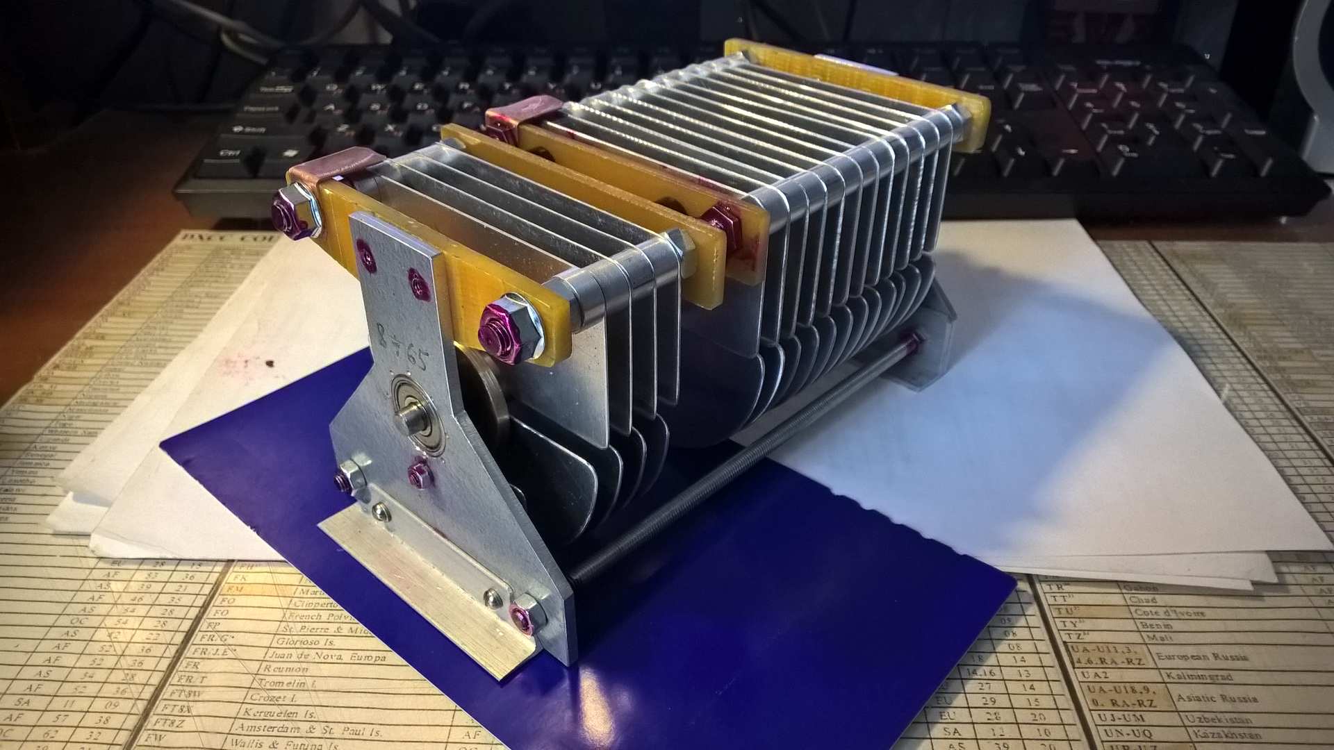 Две секции. 8-65пф и 18-210пф. Зазор между пластинами ротора и статора 2,5мм. Надежный токосьем. Размеры 85х85х160. Ось 6мм длинна 34мм. Вращение в круговую.