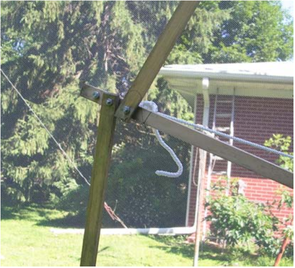 Нейлоновые веревки подтягивают каждую спицу к опоре . Длина их была отрегулирована, чтобы радиус (расстояние X) каждой спицы составлял 2,3 метра (7,5 ').