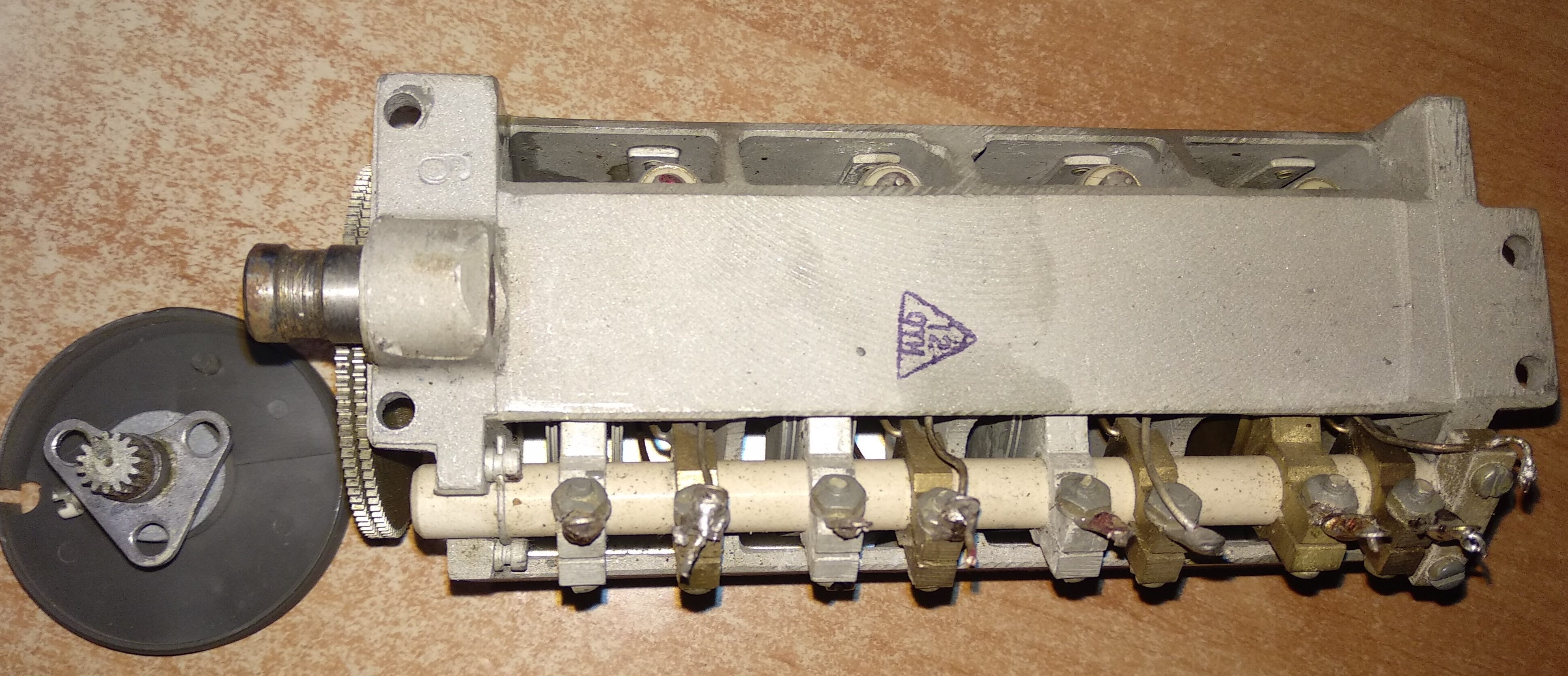 Продам 4-х секционный конденсатор переменной емкости от р/с Р108. И верньер.