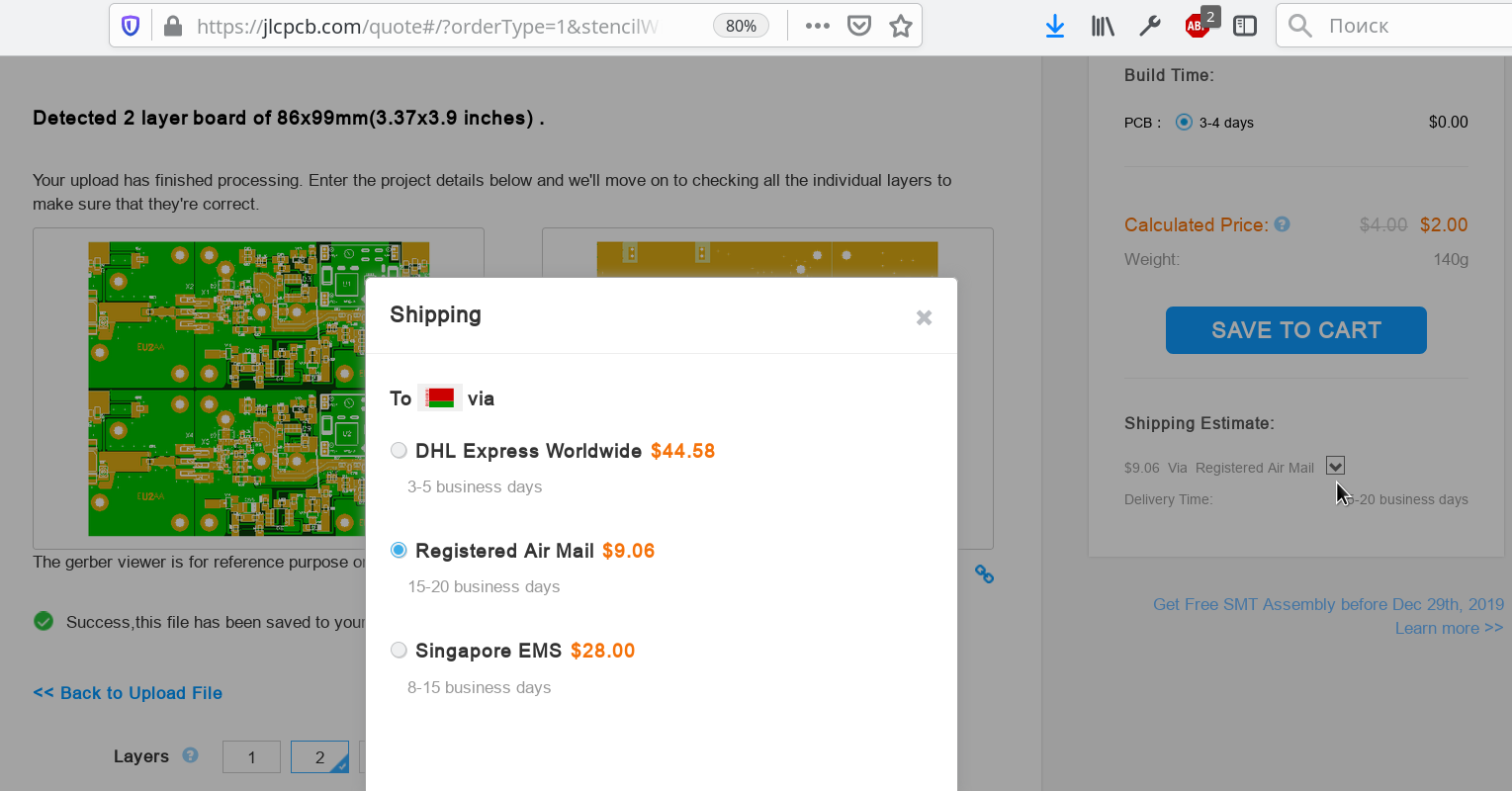 Владимир Ильич, на JLCPCB все по-прежнему. Сегодня заказывал платы. Нужно только выбрать правильный способ доставки ...EU2AA писал(а):JLCPCB взвинтил цены за доставку до $45!