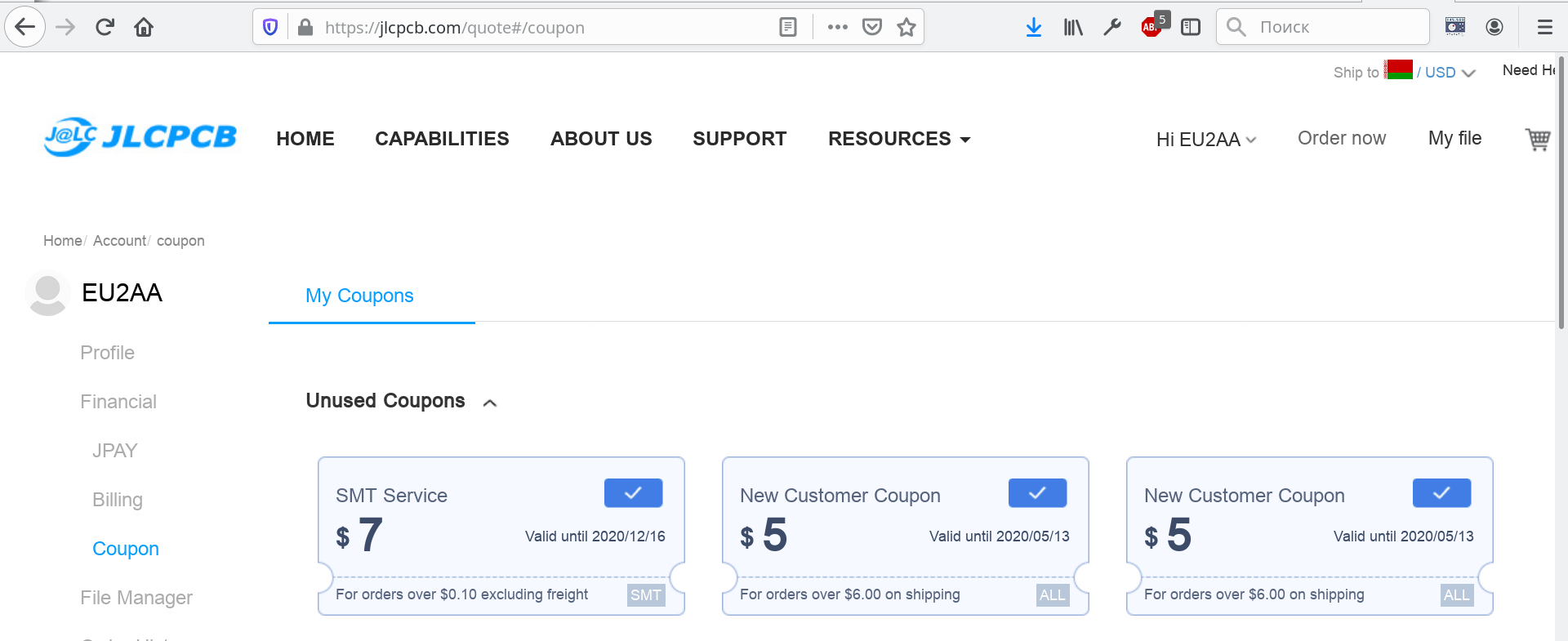 4. Иду в почту, открываю письмо, там ОБЕЩАНЫ СКИДКИ: "И поздравляю, вы получили скидку 25 трампов на ваши заказы в JLCPCB. Два купона на скидку 5 долларов на доставку, скидку 8 и 7 долларов на заказ SMT вы можете найти в своем СЧЕТЕ >> Финансовый >> Купон. (And congratulations, you've received $25 discount for your orders at JLCPCB. Two $5 off coupons for Shipping Charge, $8 and $7 discount for SMT order, you can find them in your ACCOUNT>>Financial>>Coupon.)