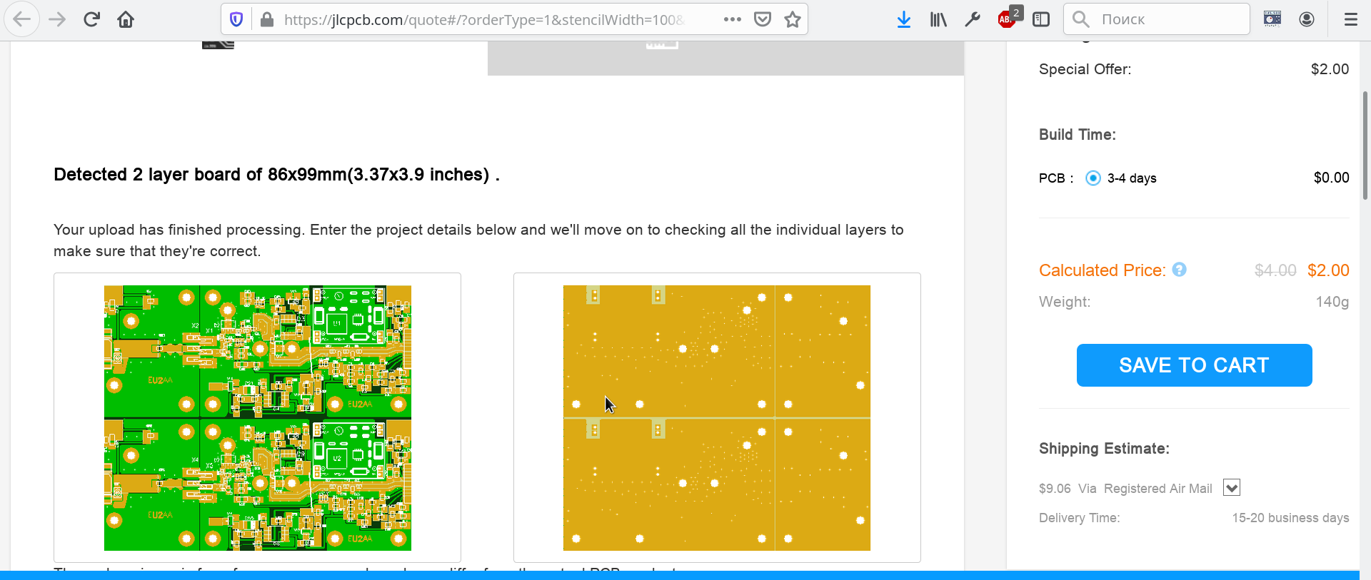 Вижу, что плата в 2 слоя, размер 86х99мм, 5 штук, толщина 0,6мм, маска зеленая (желтую действительно перестал принимать!), лужение HASL...