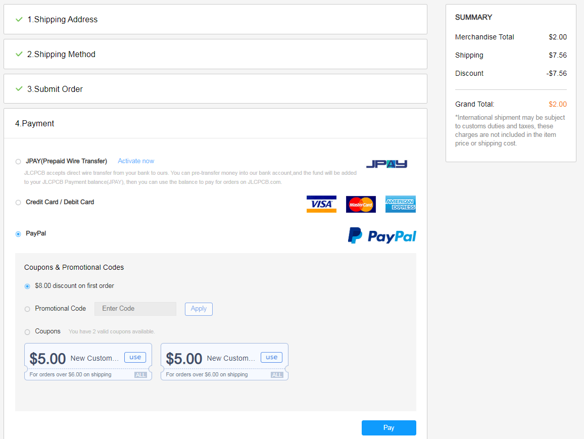 Убеждаюсь, что купоны применены, с меня причитается $2 за все, включая доставку.