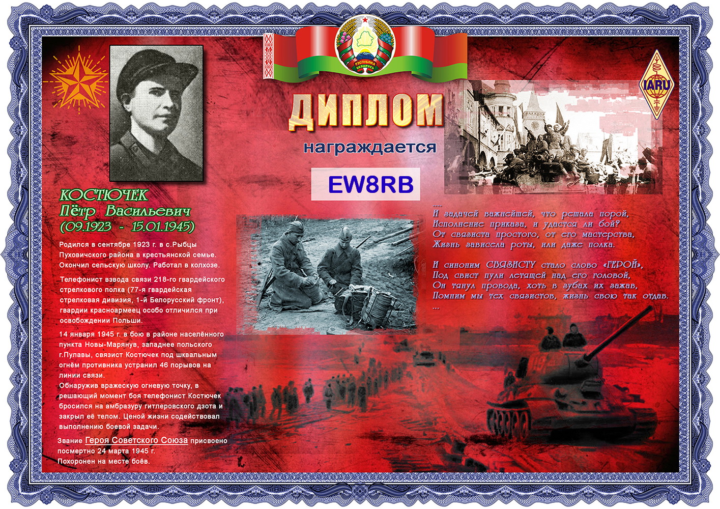 Заявку на диплом направлять на EW8RB@tut.by или, в последующем, через hamlog.ru.