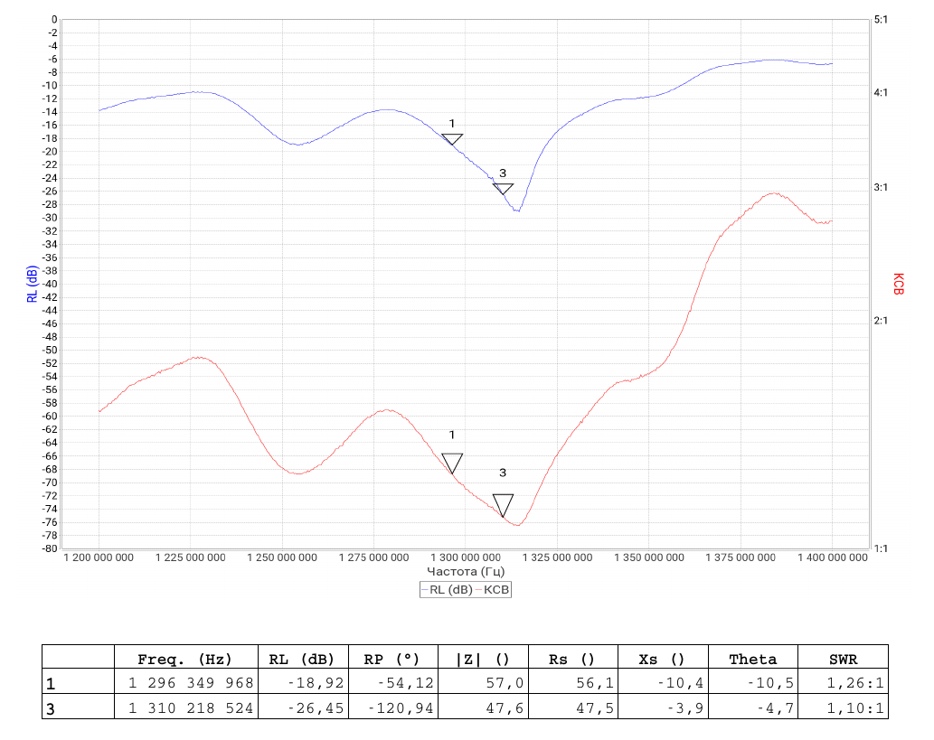 Измеренный Кусиления на частоте 1296МГц составил +18dBd, т.е через децибельник 20dB на 2dB хуже, чем вибратор-эталон.