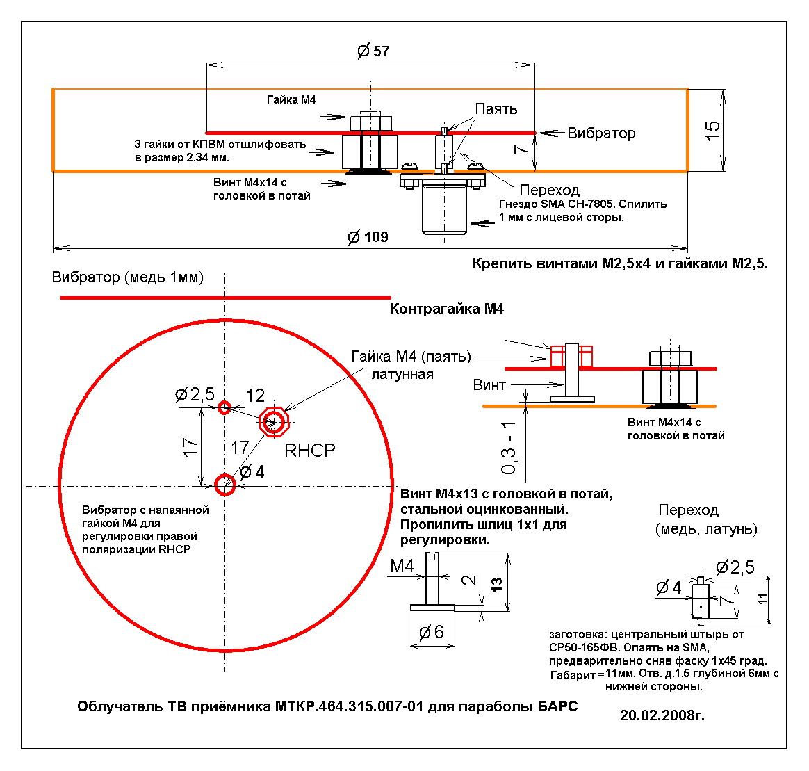 При установке на параболу переизлучается как Правая круговая поляризация - RHCP Эскиз деталей Пошаговая инструкция