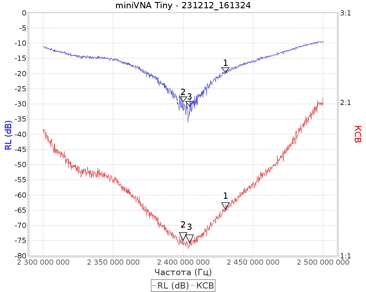 6.С помощью miniVNA измерил КСВ, с хорошим КСВ настроился на 2360МГц.