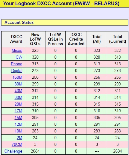 Были выполнены условия трудных и престижных дипломов 5BWAZ #993-200zones (https://www.cq-amateur-radio.com/cq_awa ... isting.pdf) (четвертый в РБ) и WAZ160 #449-40zones (https://www.cq-amateur-radio.com/cq_awa ... isting.pdf) (второй в РБ) (это можно увидеть также на http://qrz.by/dxing/progress-waz/, а также на сайте CQ MAGAZINE). А также по дипломной программе DXCC подтверждены в LoTW и бумажными QSL радиосвязи с радиолюбителями 324 стран и территорий мира, это можно увидеть в неофициальной таблице "Достижения белорусских радиолюбителей в DX-инге", которую ведет Андрей EU7A (https://onedrive.live.com/view.aspx?res ... jAMjQ1oFxA).