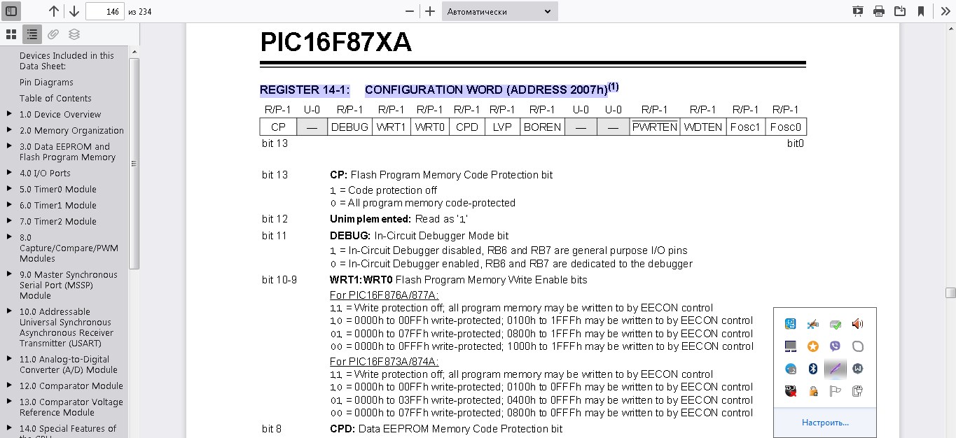 Виноват, злобно вкралась ошибочка. 146 страница - это в pdf редкторе. В даташите - стр. 144. Полностью расписаны все биты конфигурации. .hex файл можно открыть в любом hex-редакторе, например: https://www.softportal.com/software-403 ... ditor.htmlVERN писал(а):Это я и сам знаю.А где данные какая должна быть конфигурация в данном,конкретном случае? На стр.146 всего лишь,какой тактовый генератор использовать.Внешний, внутренний или RC?Наверное это и вся конфигурация?