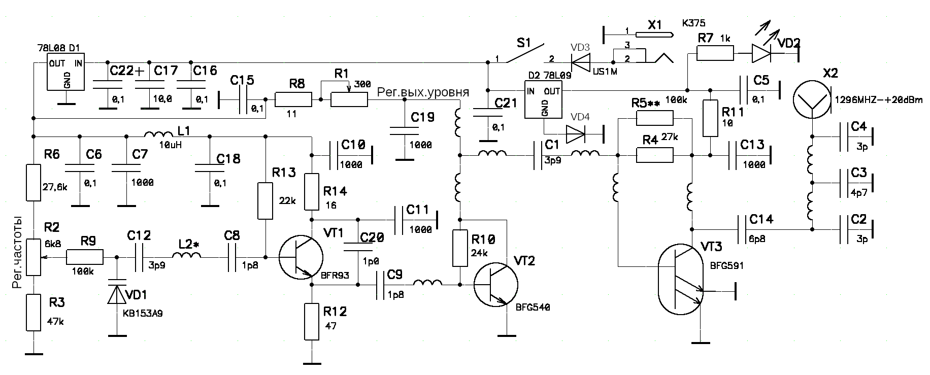 Возможно, потребуется подобрать номинал переменного сопротивления R1, чтобы достичь диапазона перестройки выходного уровня (0-+20)dBm.
