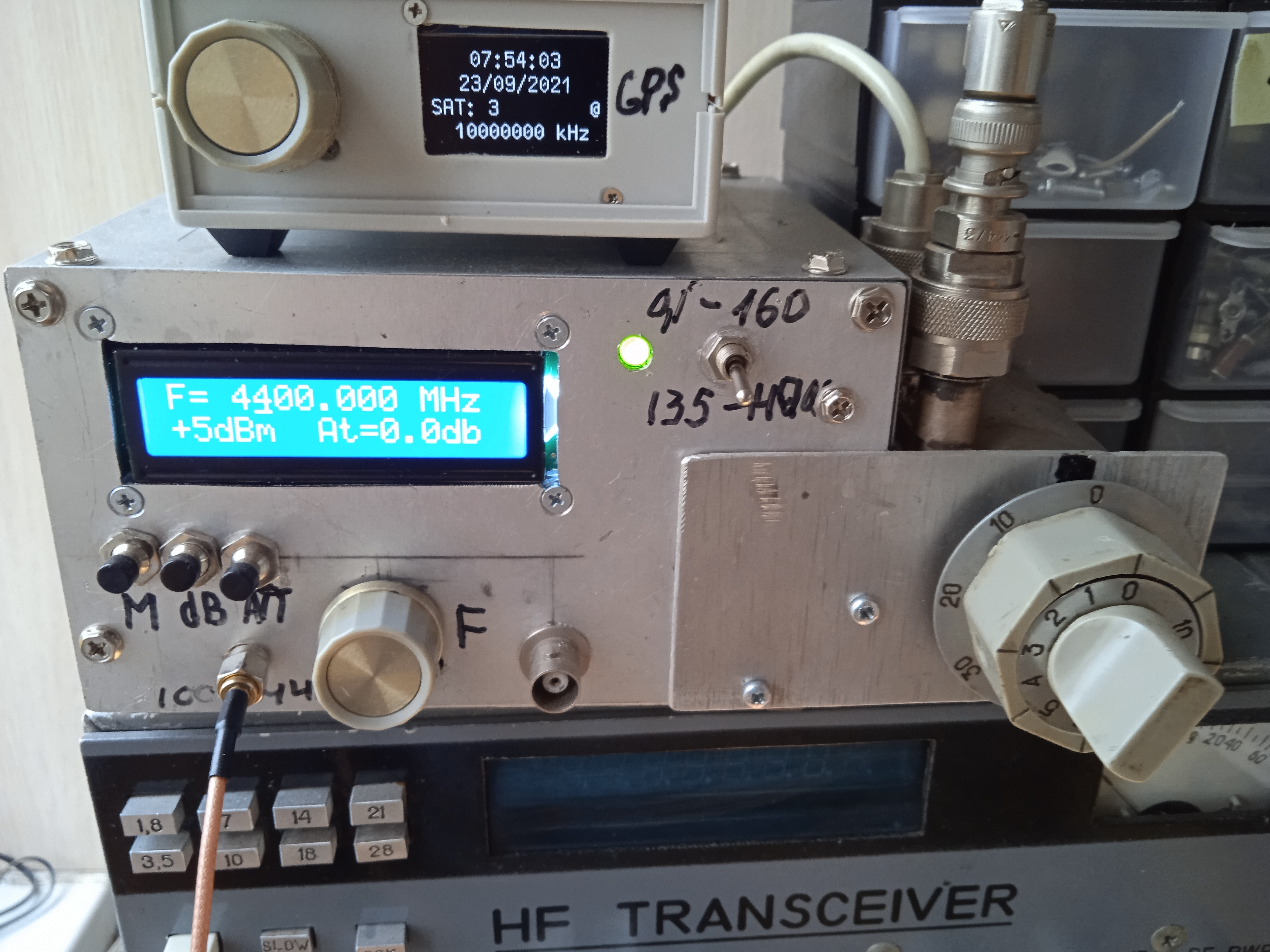 Рискну вставить свои "пять копеек"... Тоже генератор 100khz-4.4Ghz Элементная база: Ардуино SI5351 , ADF4351 ATT PE-4302 в диапазоне 100Mhz-4.4Ghz и от Х1-49 в диапазоне 100khz-160Mhz В опоре либо кварц с подогревом от "Маяка" либо от Gps синхронизируемого генератора-переключается... Автор конструкции и SERBUS VHFDX.ru Извиняюсь за внешний вид конструкции , но к сожалению, такие работы мне не доступны...