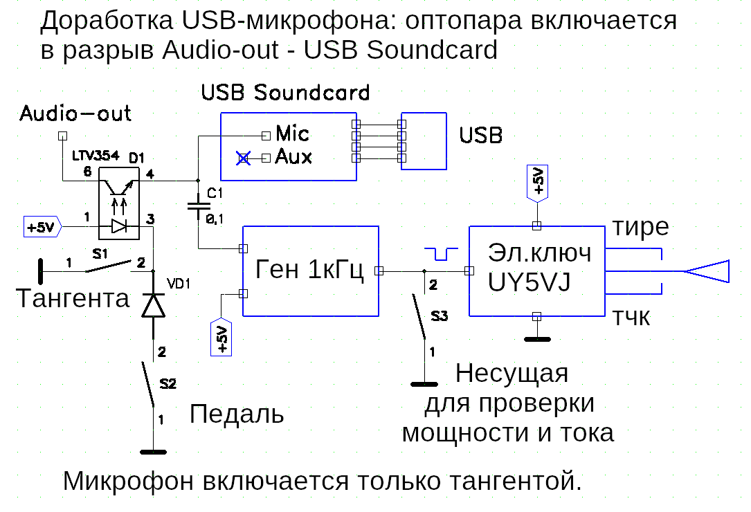 При нажатии РТТ в предварительном усилителе УМ1 корпус подается в центральную жилу кабеля.