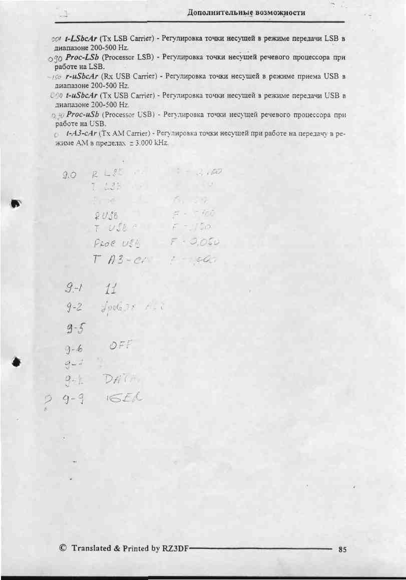 Эти регулировки опору сдвигают в полосу пропускания, в моем случаи и -200 маловато, меню 9-0, можно сдвинуть больше, но это не выход,на сколько сдвигаешь опору в полосу, на столько-же сужается нужная боковая полоса. Видимо надо смотреть 2-ой, или 3-ий гетеродин. В LSB звучит класс, при USB ухо не радует.