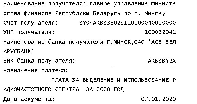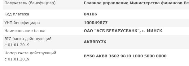 Лично проверяли 1.01.2019 ?EW3BI писал(а):Не придумывайте. Реквизиты на оплату на сайте БелГИЭ были актуальны по состоянию на январь 2019 года и больше не изменялись.