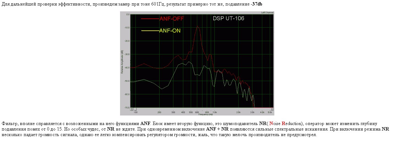 Фильтр, вполне справляется с возложенными на него функциями ANF. Блок имеет вторую функцию, это шумоподавитель NR( Noise Reduction), оператор может изменить глубину подавления помех от 0 до 15. Но особых чудес, от NR не ждите. При одновременном включение ANF + NR появляются сильные спектральные искажения. При включении режима NR несколько падает громкость сигнала, однако ее легко компенсировать регулятором громкости, жаль, что такую мелочь производитель не предусмотрел.