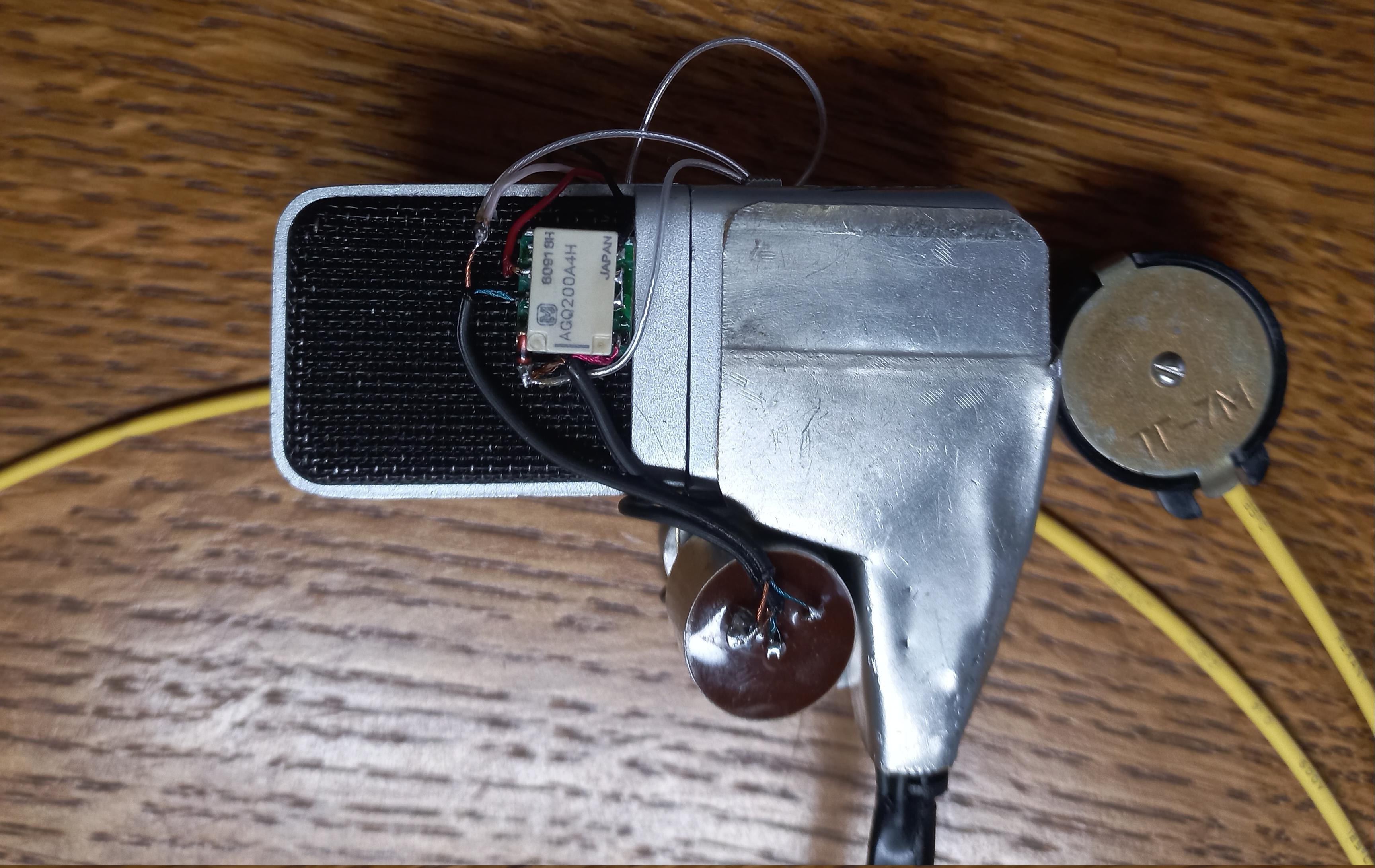 Мне пришлось из корпуса микрофона вынуть плату и вместе с платой генератора 1кГц разместить в корпусе от бесшнуровика.